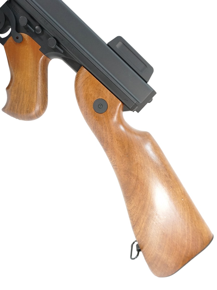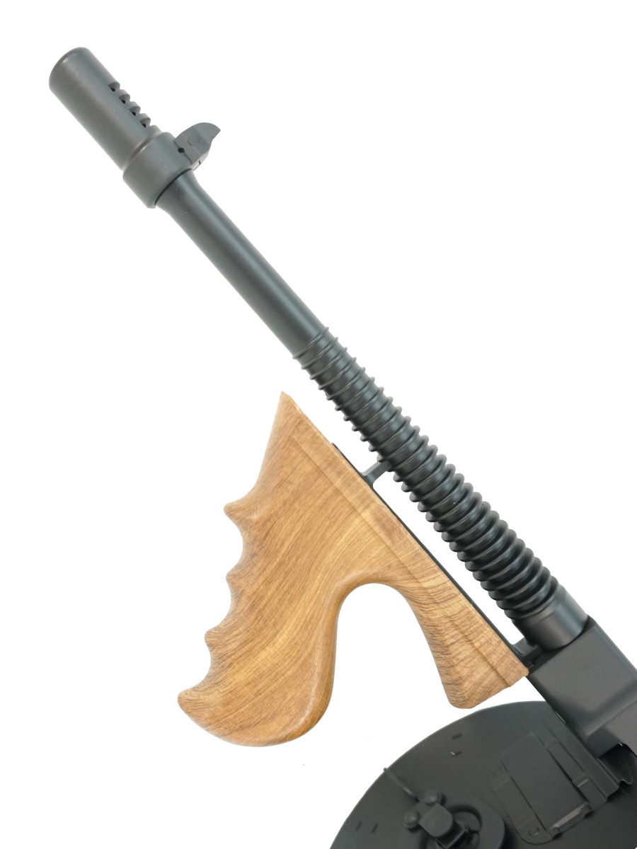 Цевье, приклад и рукоятка автомата Cyma Thompson M1928A1 изготовлены из пластика, причем цвет полимера максимально повторяет оттенок натуральной древесины, как в оригинале. Материал корпуса и ответственных элементов – оружейный металл, покрытый воронением для защиты от коррозии.