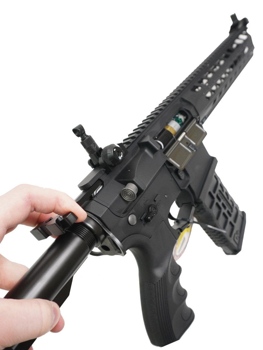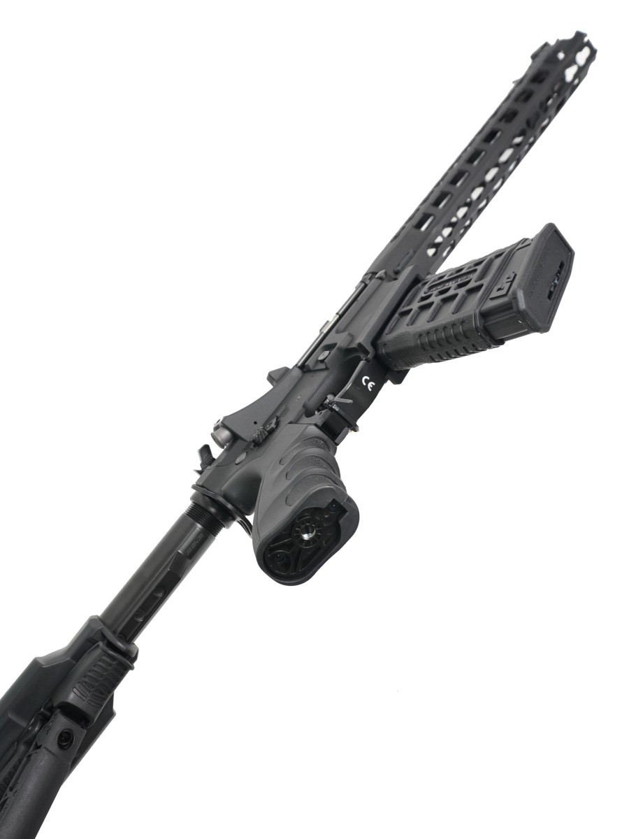 Привод отличает телескопический приклад с шестью позициями. Основной материал – металлический сплав, все фиксирующие элементы автомата стальные. Приклад и пистолетная рукоятка выполнены из качественного ABS-пластика. На цевье предусмотрены отверстия для закрепления навесного оборудования, на верхней части ствольной коробки установлена рельса для оптики.