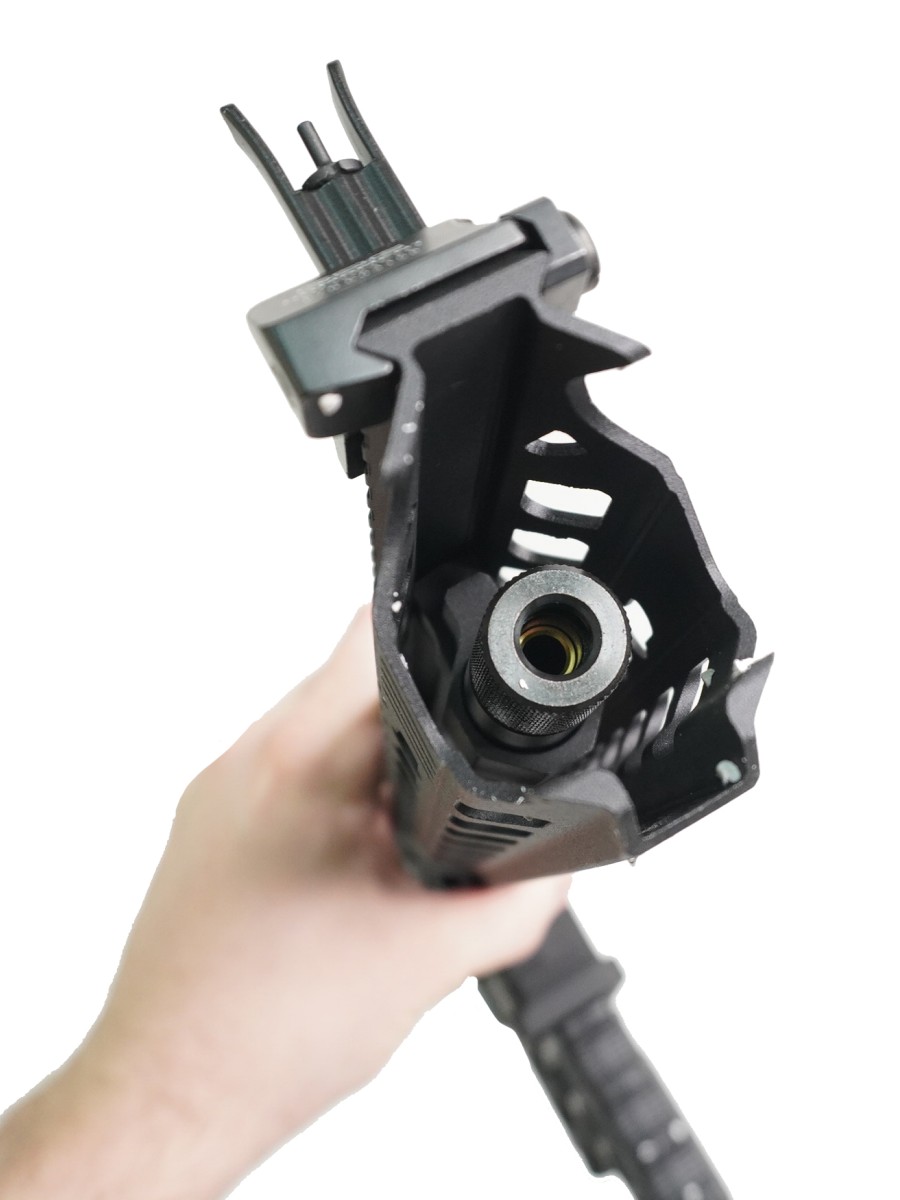 Прицельные приспособления механические, при необходимости их можно сложить либо полностью снять. В прикладе автомата имеется отсек для дополнительного элемента питания и прочих мелочей. Кнопка сброса магазина и флажковый переключатель дублируются с двух сторон автомата.