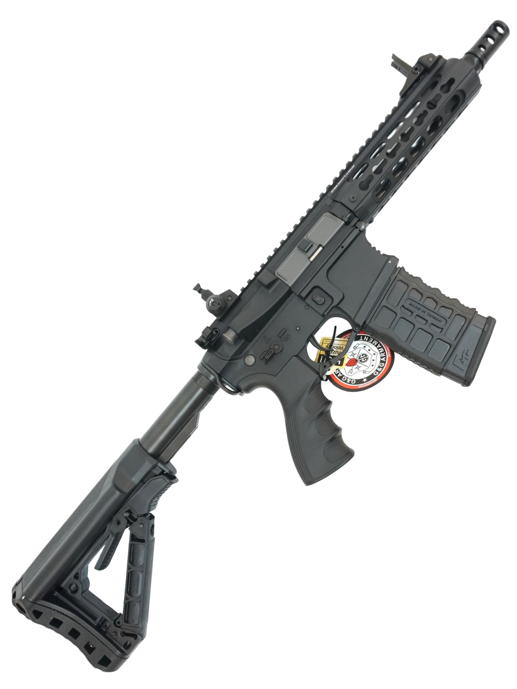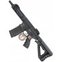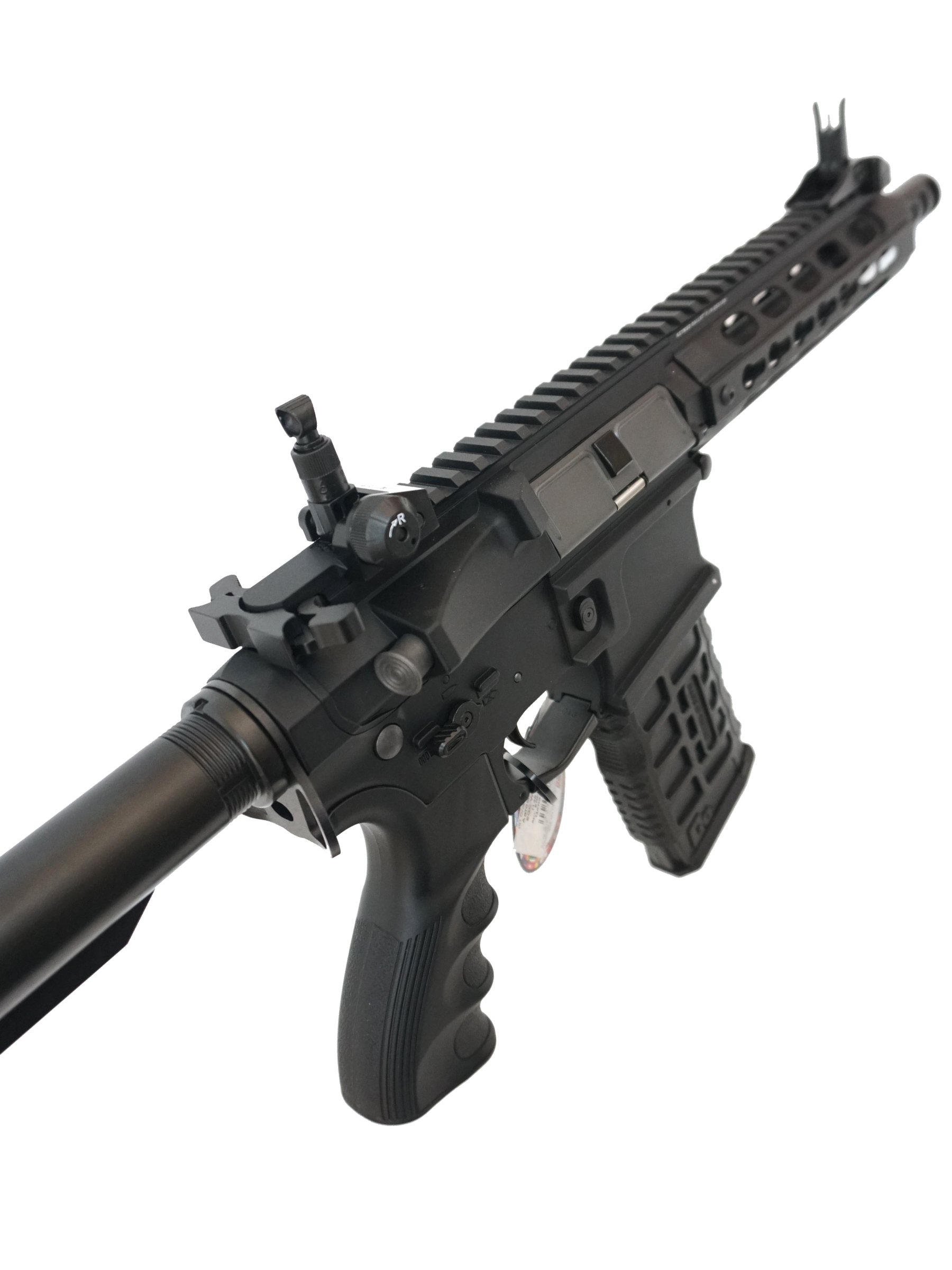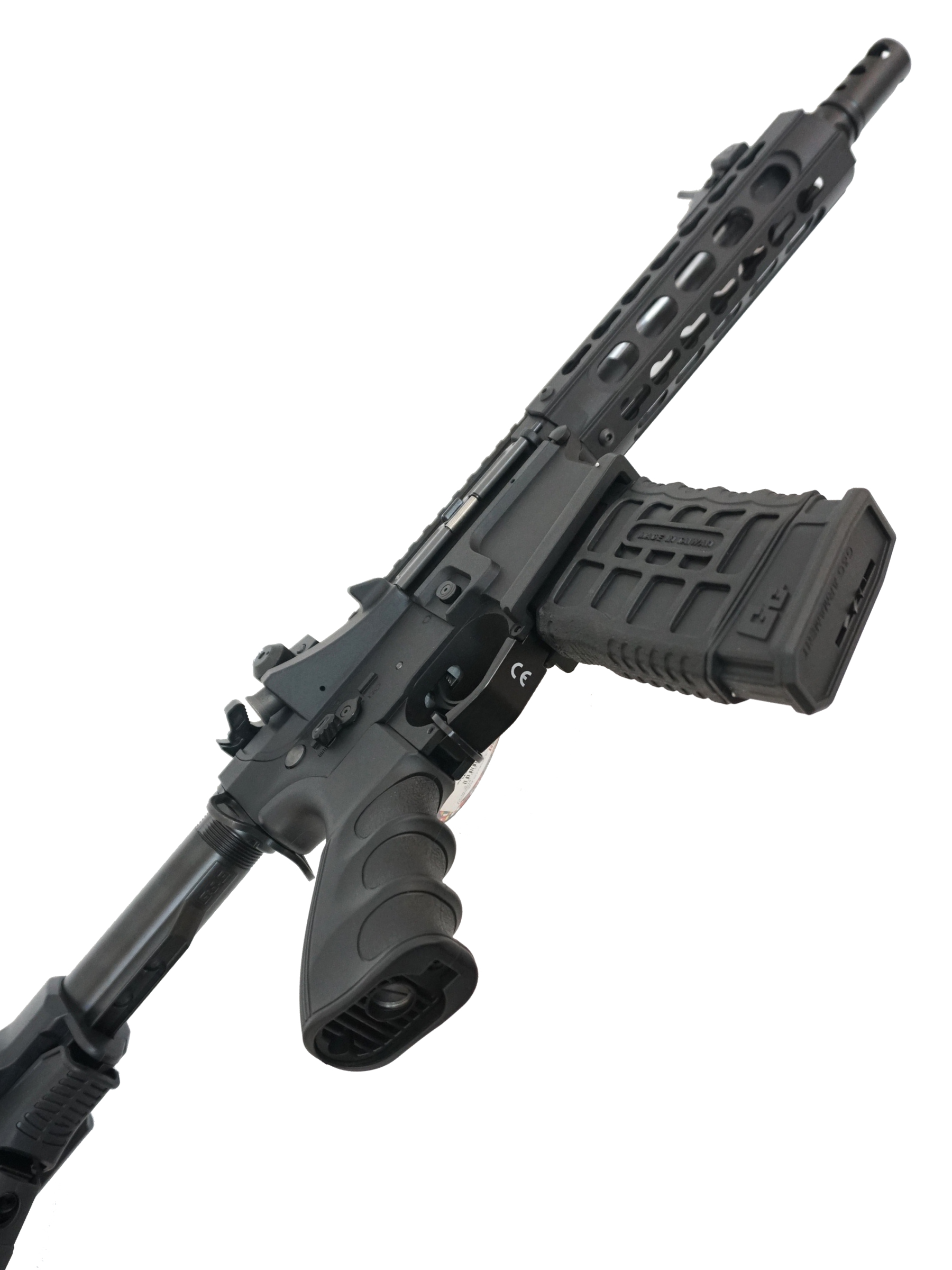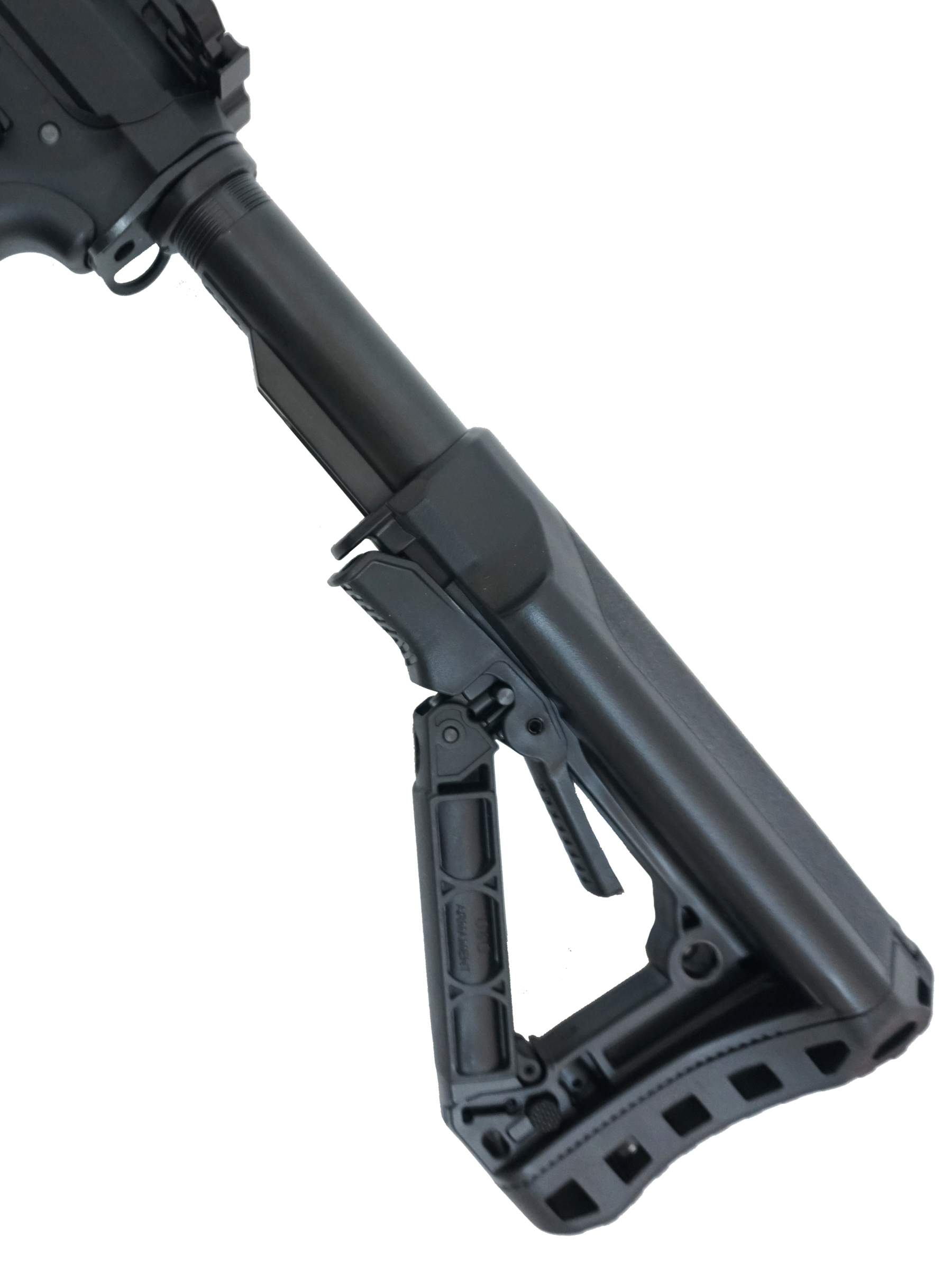 Приклад автомата телескопический, типа Crane Stock, фиксирующий зажим позволяет установить оптимально подходящую для каждого стрелка длину привода. Рукоять пистолетного типа из пластика ABS удобной формы, с выемками под пальцы. Приклад содержит в себе дополнительный отсек для батареек и прочих мелочей.