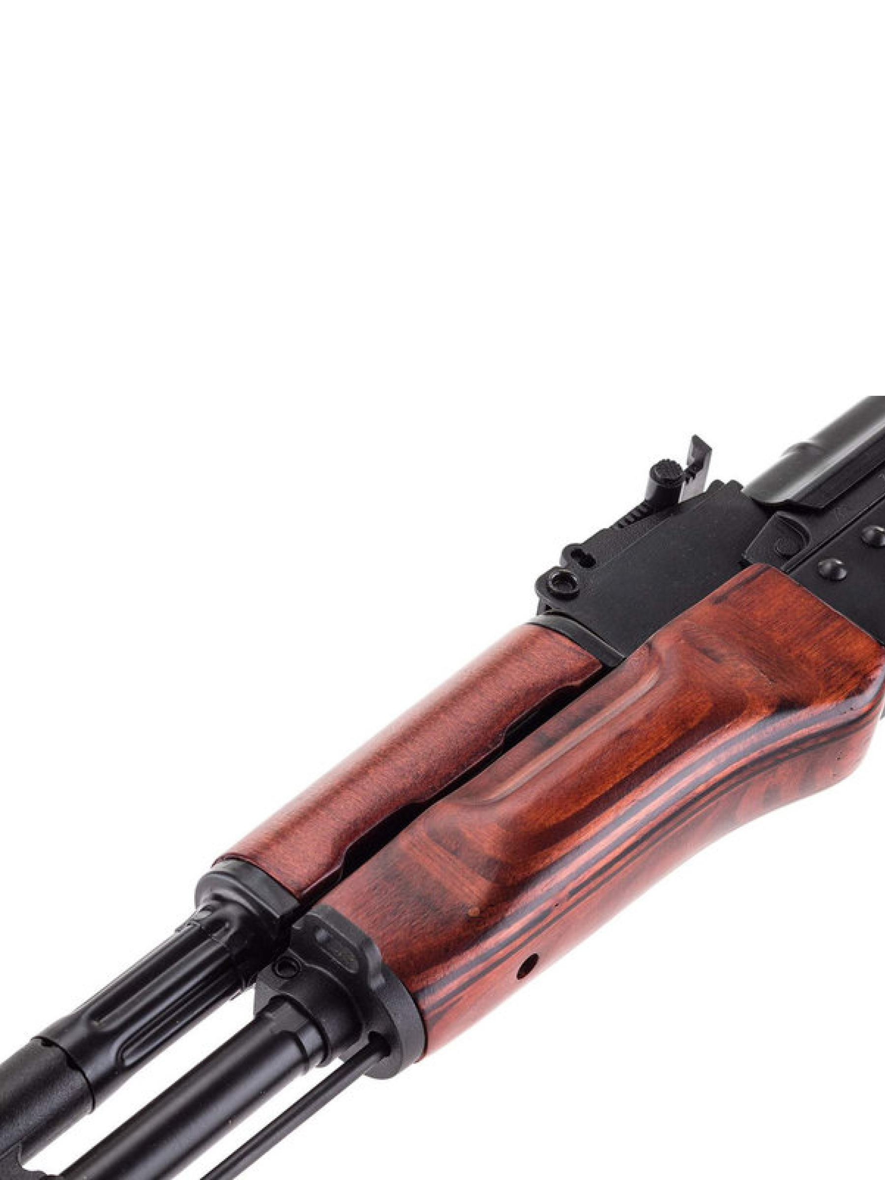 Автомат Калашникова АКС-74 поступил на вооружение в 1974 году, и был развитием версии АК-74, отличаясь от предшественника более легким весом и наличием складывающегося металлического приклада взамен деревянного. В откинутом положении приклад удерживался фиксатором, в сложенном – крепился к ствольной коробке специальной защелкой. Бренд LCT предлагает страйкбольный вариант АКС-74, и является производителем качественных airsoft копий популярного стрелкового оружия.