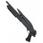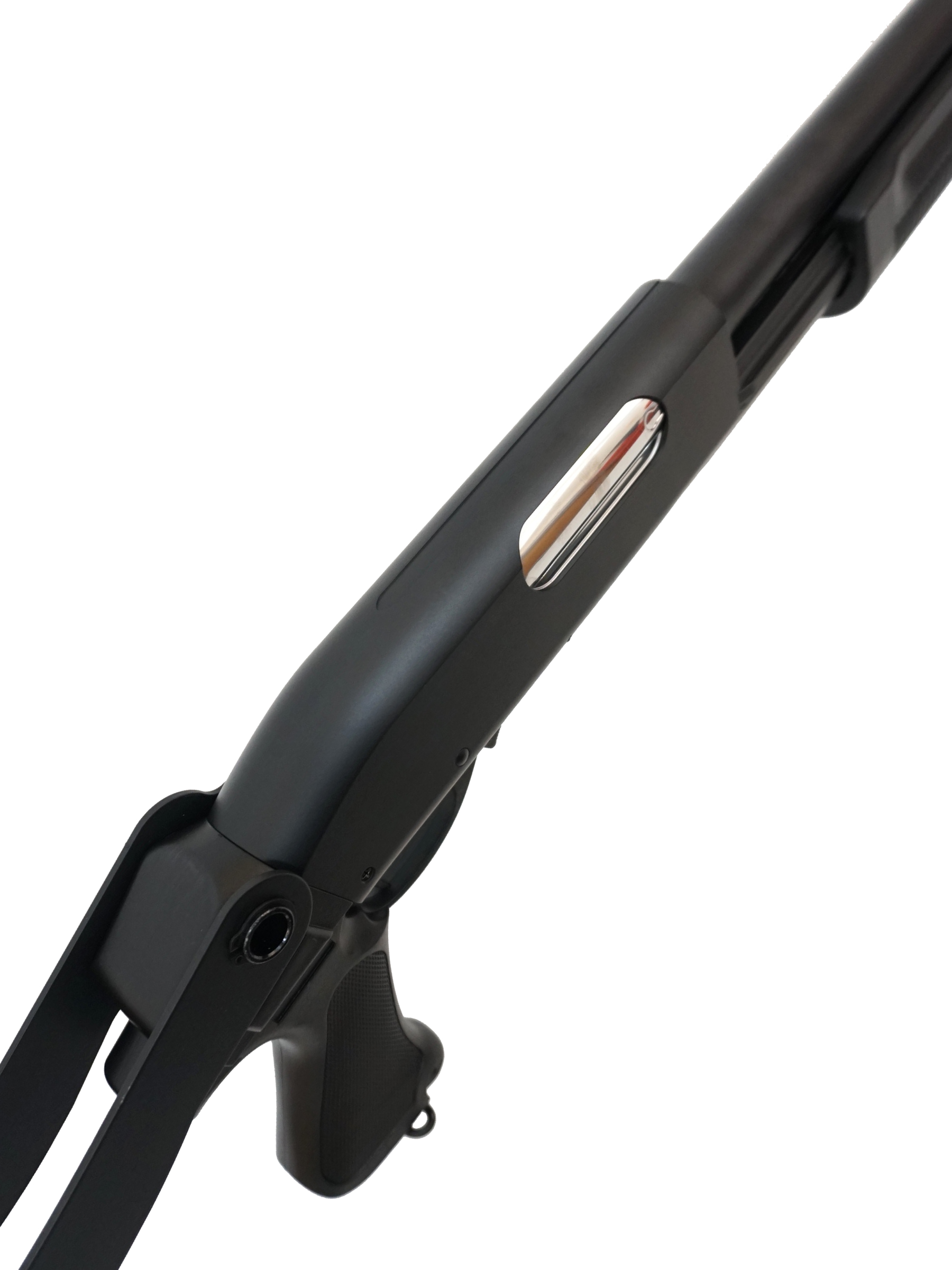 Несомненным преимуществом данной страйкбольной модификации Ремингтона М870 является использование алюминиевого сплава, что способствует уменьшению веса ружья. Рукоятка пистолетного типа и цевье выполнены из полимерного материала. Конструкция приклада простая и надежная, складывание его осуществляется одним движением, на верхнюю часть ствольной коробки.