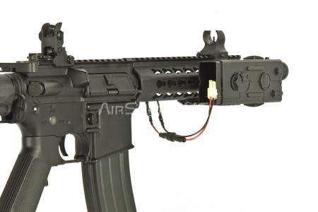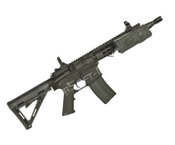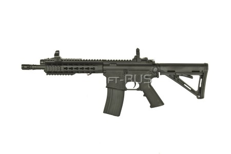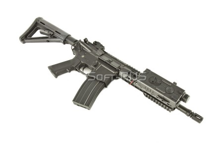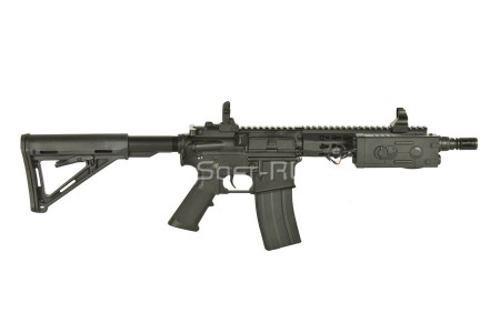 Особенность данного автомата – удобный телескопический приклад, позволяющий настроить его длину индивидуально, и RIS-цевье с тактическими планками для установки прицела, фонарика, ЛЦУ и прочих аксессуаров. Привод изготовлен из сплава алюминия, все детали хорошо подогнаны между собой, без явных люфтов. Приклад и рукоятка изготовлены из пластика.