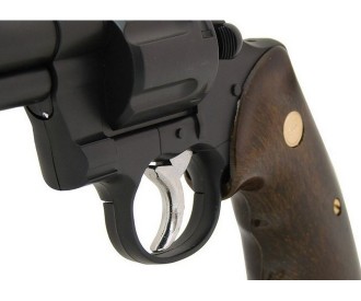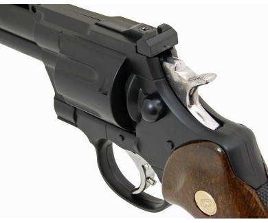 Основной материал – качественный полимер, курок и ответственные элементы изготовлены из стального сплава, рукоятка с отделкой «под дерево». Вес револьвера небольшой – 0,48 кг, длина – 30 см. Комплектует изделие инструкцией и магазином.