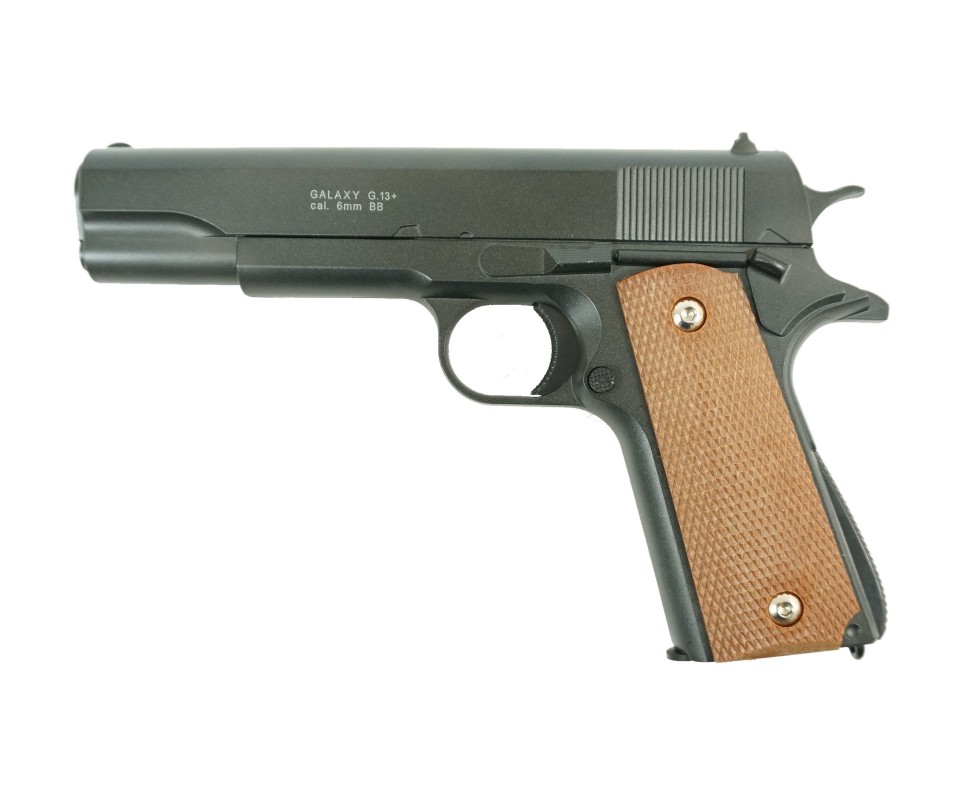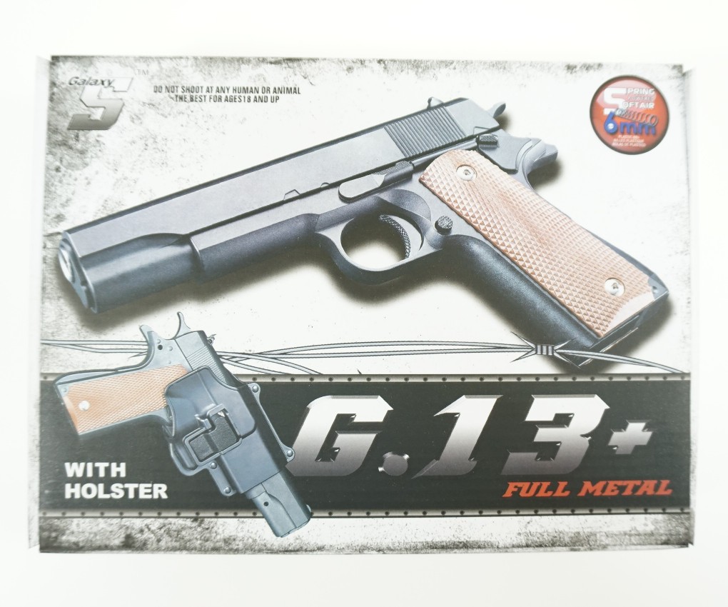 Galaxy G.13+ - качественная спринговая страйкбольная модель классического пистолета Colt 1911, изготовленная из качественного цинкового сплава и пластика. Цвет черный, комплектуется полимерной тактической кобурой. Начальная скорость выстрела шарика 70-79 метров в секунду.