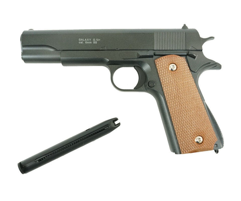В действительности, тайваньская модель Galaxy G.13 является абсолютно безопасным пистолетом для страйкбола, оснащенным спринговым механизмом. Он комплектуется магазином на 12 патронов для шариков, диаметром 6 мм. Благодаря особенностям пружинного механизма и строения дула, пули способны развивать скорость до 79 м/сек., что делает пистолет для страйкбола абсолютно безопасным в эксплуатации. Дополнительным преимуществом модели является ее вес – всего 485 г позволяет ее удобно переносить с собой и использовать для прицельной стрельбы по движущимся и неподвижным целям.
