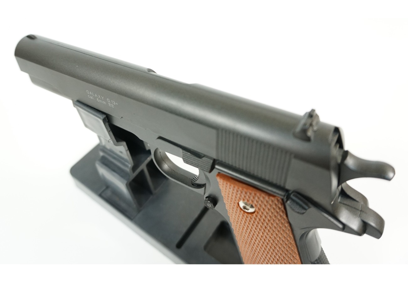 Пистолет страйкбольный Galaxy G.13+ Colt 1911 является почти точной копией оригинального Кольта американского производства. Будучи изготовленным в Тайвани из высокопрочного пластика и оцинкованного металла, представленный пистолет является отличным приобретением для каждого, кто любит страйкбол и хорошие игрушки для него. Разработчик постарался сделать этот пистолет не только высокого качества, но и оснастить его таким же внешним видом, как и настоящий американец, что делает игру вместе с ним максимально приближенной к реальности.