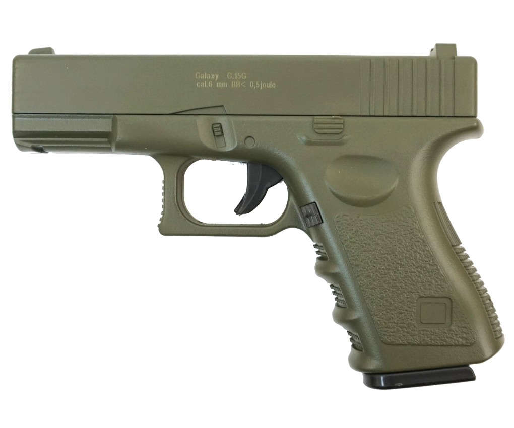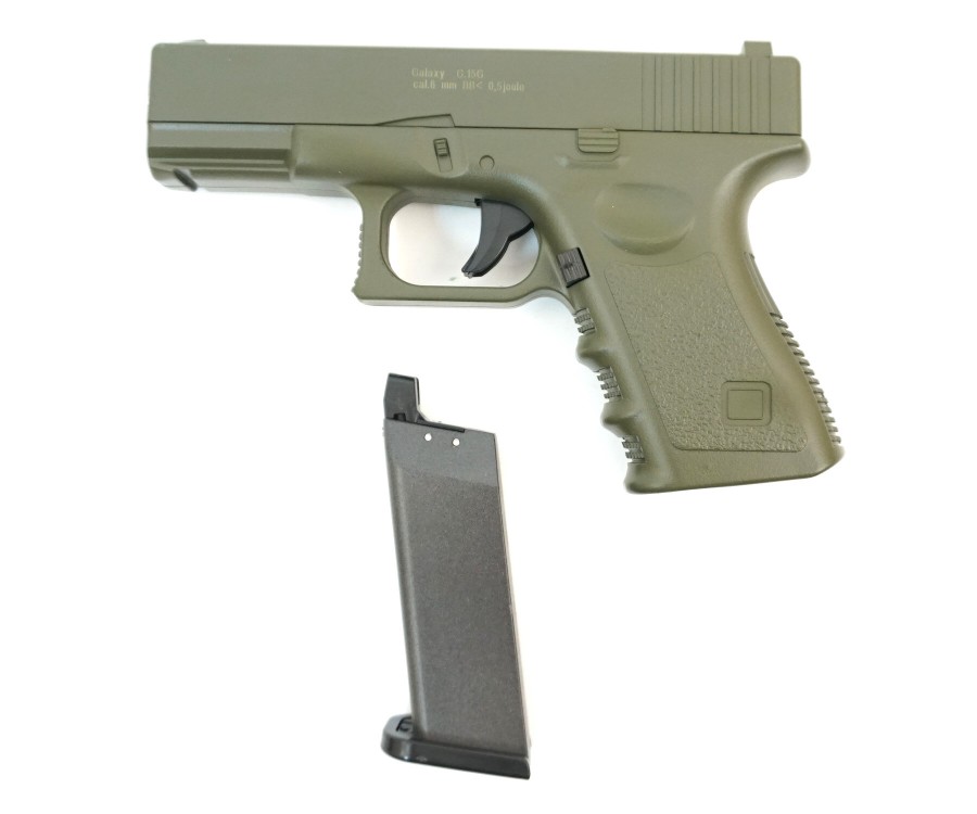 Пистолет страйкбольный Galaxy G.15G Glock 23 (зеленый) является копией оригинального Glock 17 (Австрия). Это игровое оружие, которое изготавливается из оцинкованного металлического сплава и пластика и характеризуется высокими характеристиками безопасности, износостойкости и прочности. Он предназначен для использования его в качестве вспомогательного оружия во время ведения стратегических действий, комфортен в использовании и позволяет вести огонь одиночными выстрелами при помощи всего одной руки, благодаря эргономичной рукояти и небольшому весу конструкции (675 г).