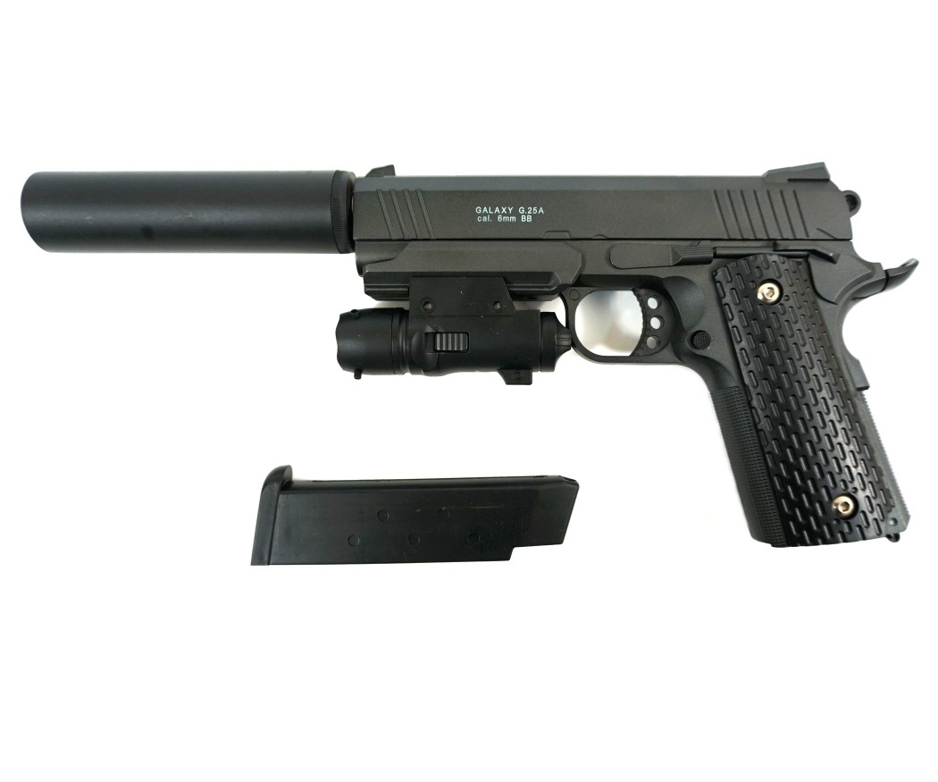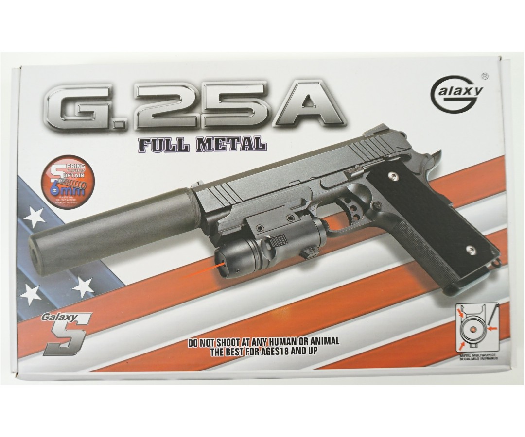Вооружитесь для тактических операций со страйкбольным пистолетом Galaxy G.25A! Эта спринговая реплика легендарного Colt M1911 от производителя Galaxy (Гонконг) представляет собой отличный стартовый набор для начинающих страйкболистов, предлагая узнаваемый дизайн и дополнительное снаряжение.