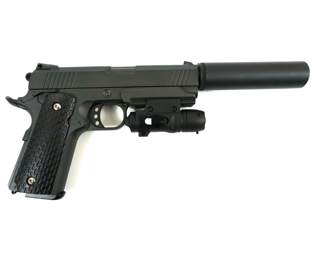 Пистолет работает в одиночном режиме стрельбы. Несмотря на отсутствие Blowback, он сохраняет узнаваемый дизайн Colt M1911. Наличие планки Weaver / Picatinny позволяет установить дополнительные аксессуары. Размеры пистолета составляют 205x140x34 мм, а вес – 585 г, что делает его удобным в использовании и переноске. В комплекте вы найдете: пистолет, имитатор глушителя, ЛЦУ, инструкцию и коробку.
