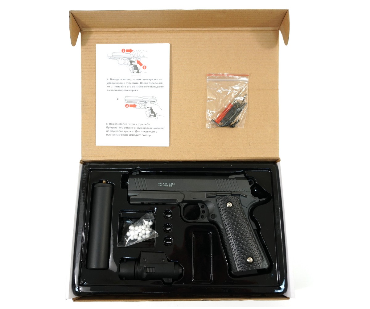 Страйкбольный пистолет Galaxy G.25A с ЛЦУ и глушителем – это отличный вариант для начинающих страйкболистов, желающих получить полный комплект оборудования для игры сразу из коробки. Почувствуйте себя настоящим тактическим бойцом с этим спринговым пистолетом!