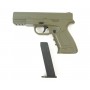 Все основные узлы и корпус выполнены из цинкового сплава и пластика ABS. Цвет исполнения – песочный. Присутствует планка под стволом, позволяющая установить на пистолет дополнительные аксессуары – фонарь, ЛЦУ и пр. Изделие отличается рукояткой эргономичной формы, что повышает удобство использования такого оружия. Вес пистолета 0,56 кг при длине 21 см. В комплекте – руководство по эксплуатации.
