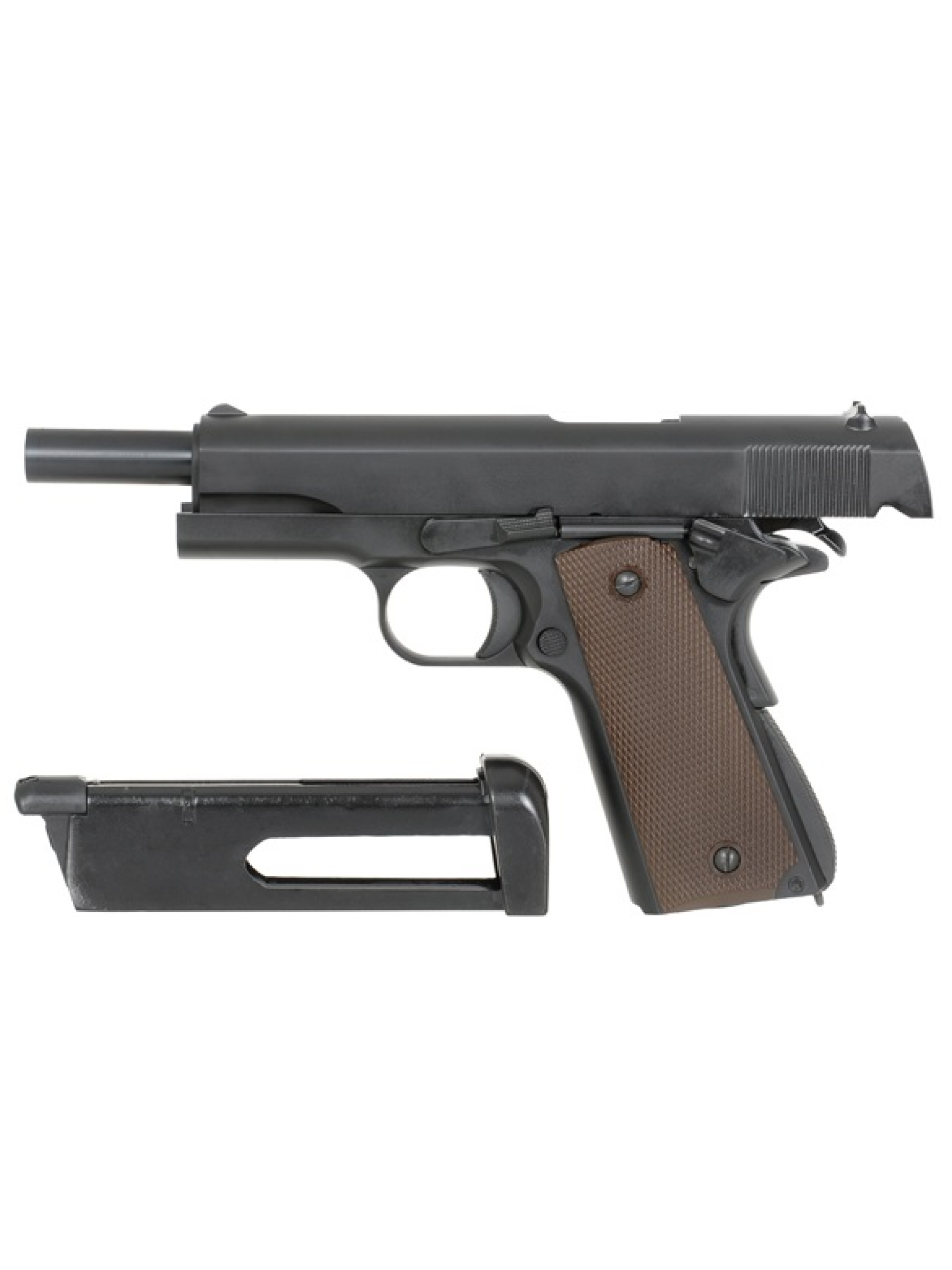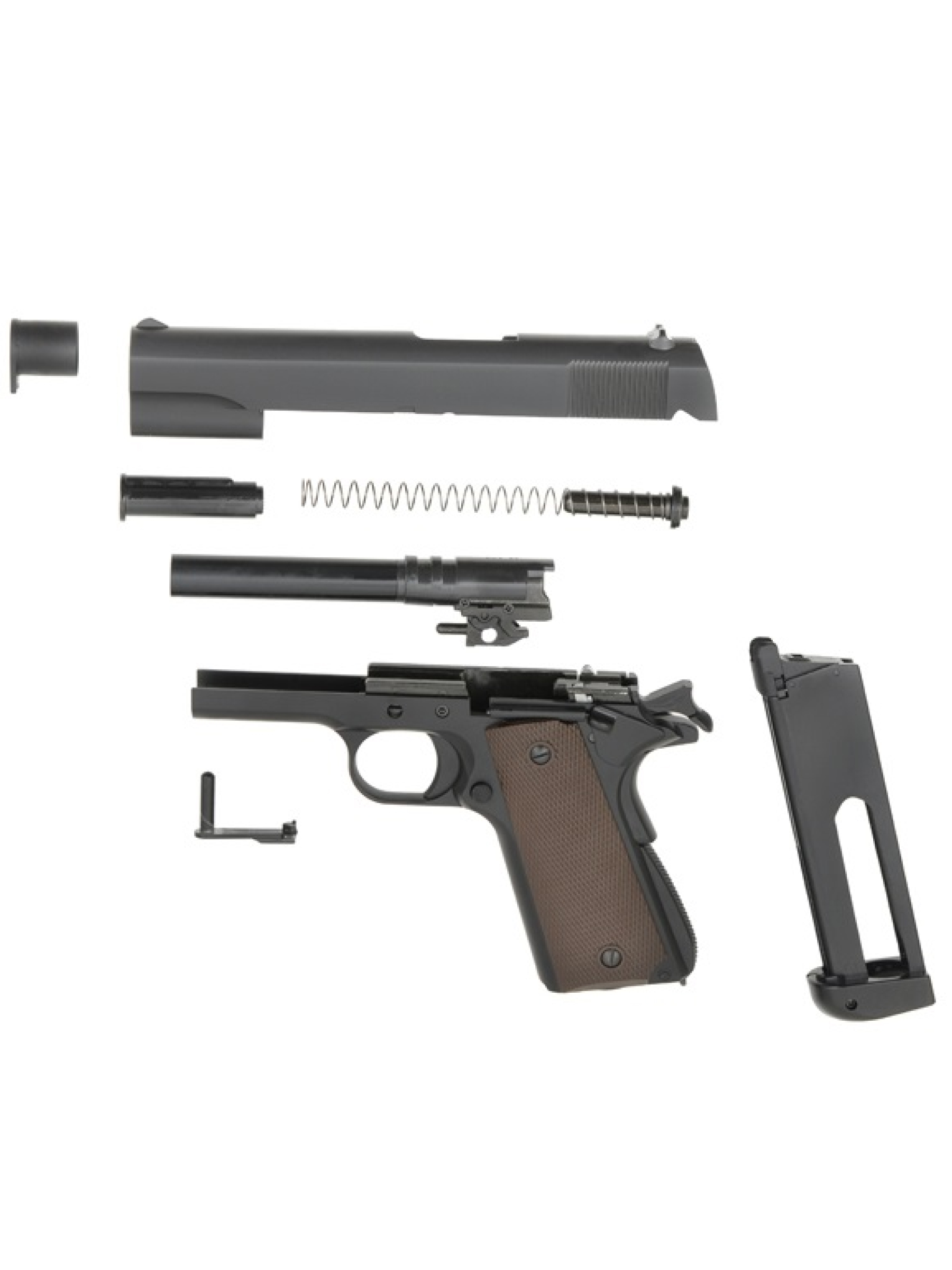 Верный своему боевому прототипу, KJW Colt M1911A1 не имеет планки Weaver / Picatinny, подчеркивая аутентичный внешний вид. Пистолет имеет полуавтоматический режим стрельбы. В комплект поставки входят: пистолет, магазин, шарики и инструкция.