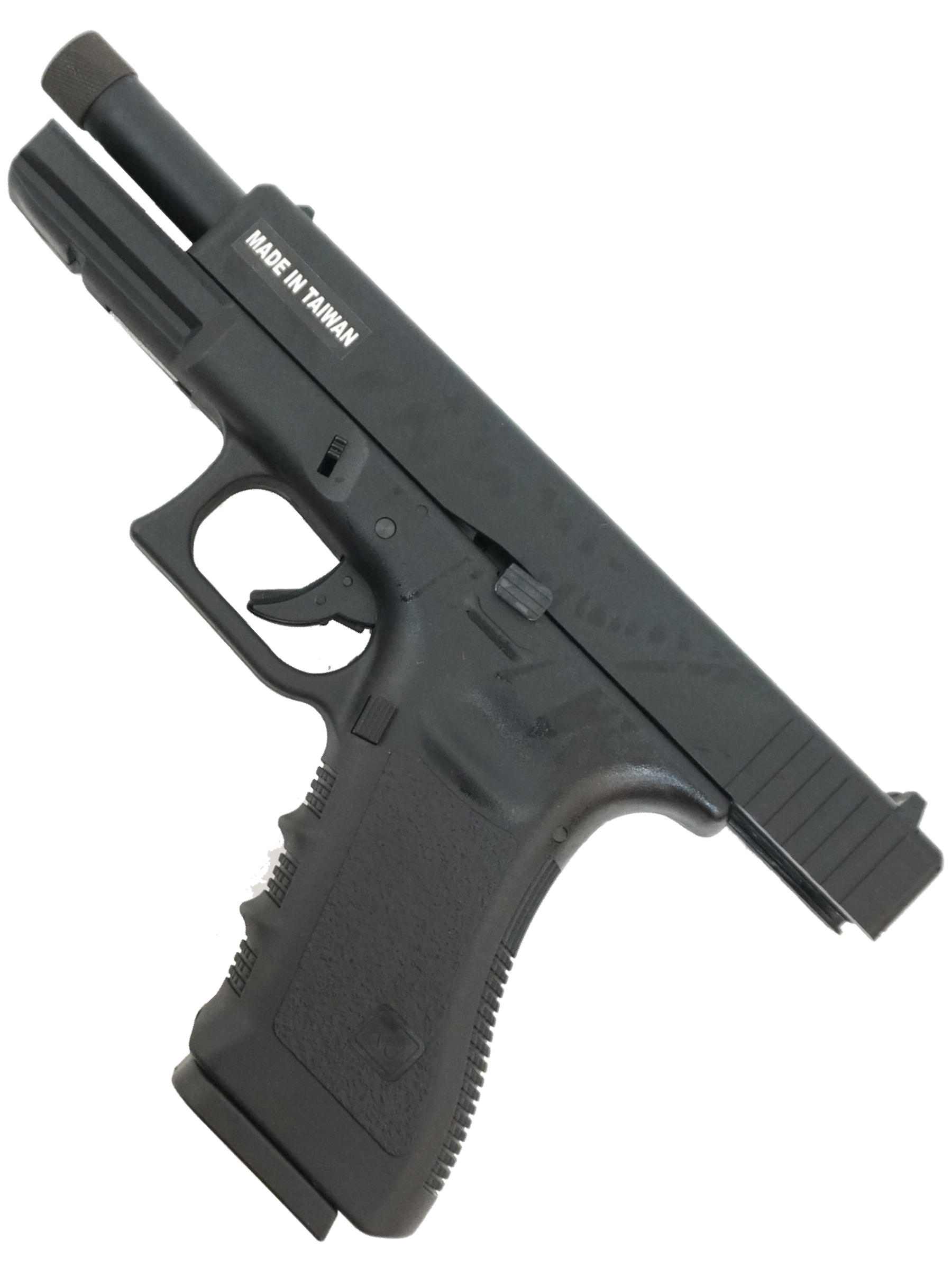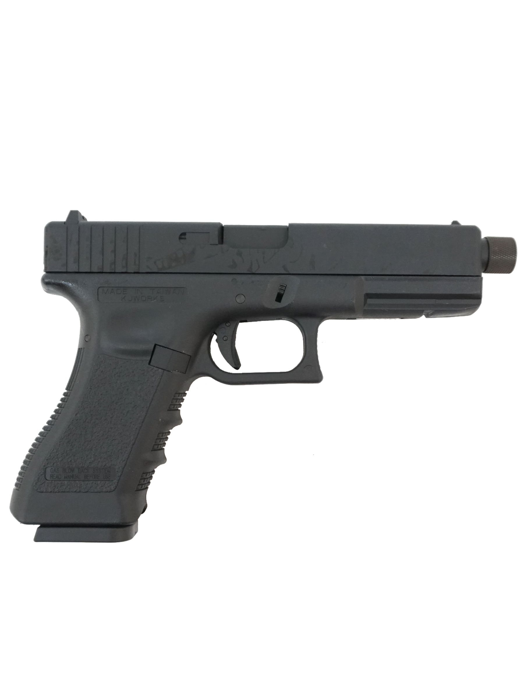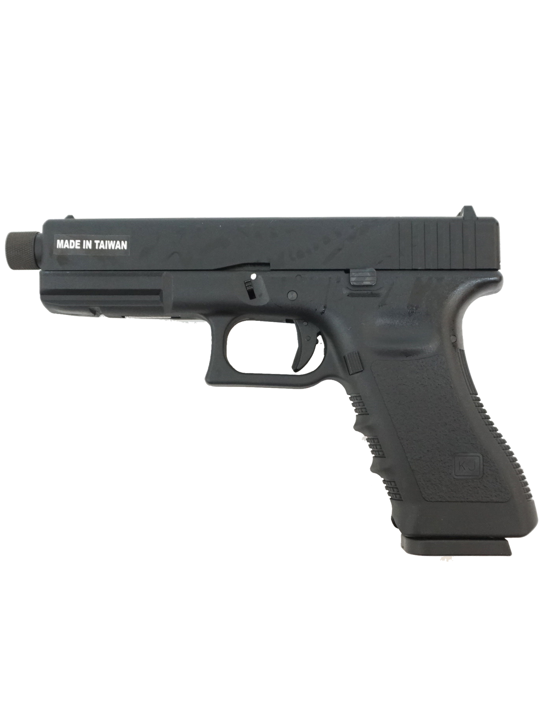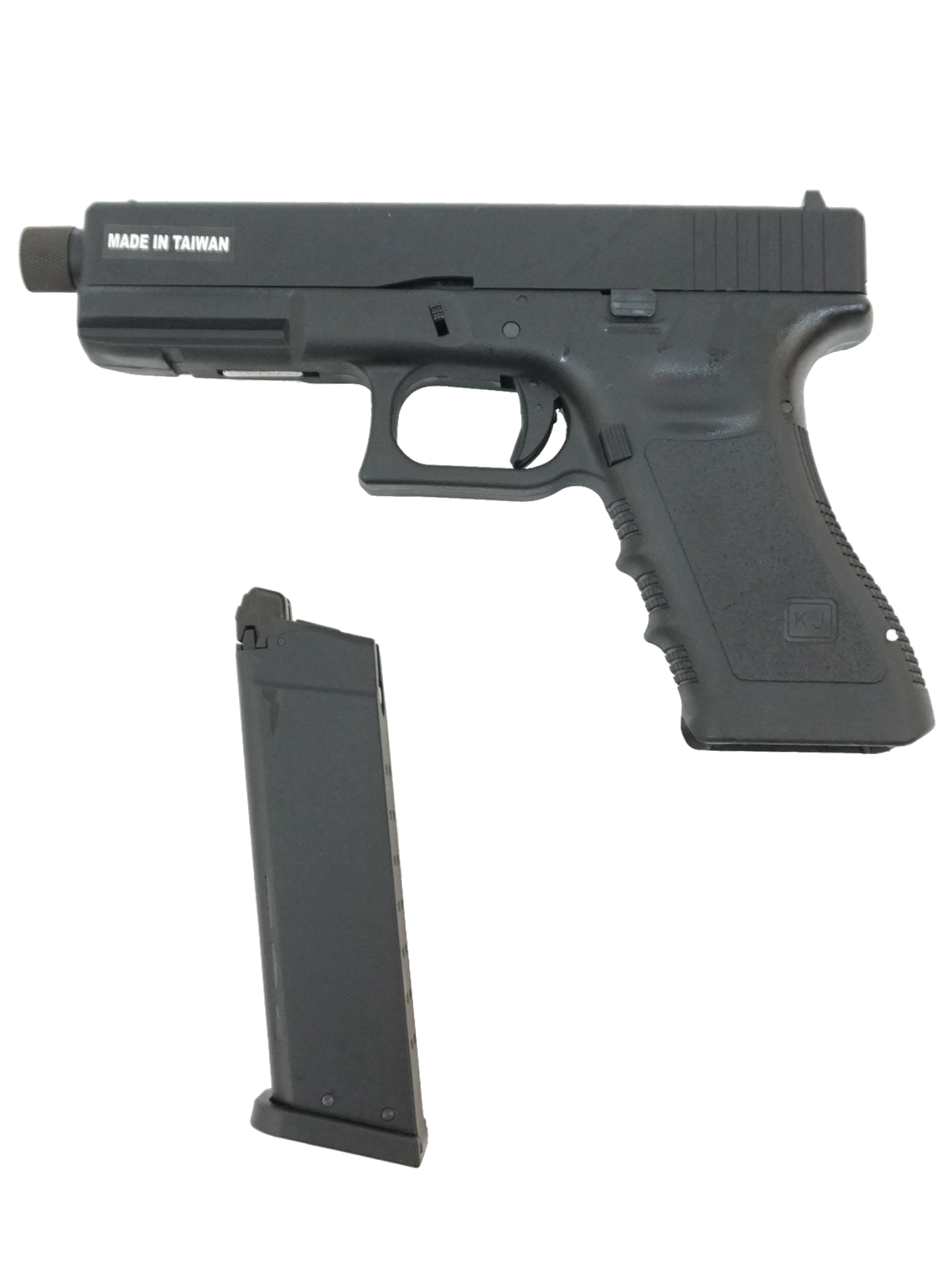 Корпус и затвор пистолета выполнены из металла, что обеспечивает высокую прочность и долговечность. Вес пистолета составляет 780 г. Главное отличие KJW KP-17 от базовой модели – это удлиненный ствол (110 мм) с резьбой под глушитель. Это позволяет устанавливать различные насадки, улучшая скрытность или видимость траектории полета шара. Общая длина пистолета составляет 205 мм.