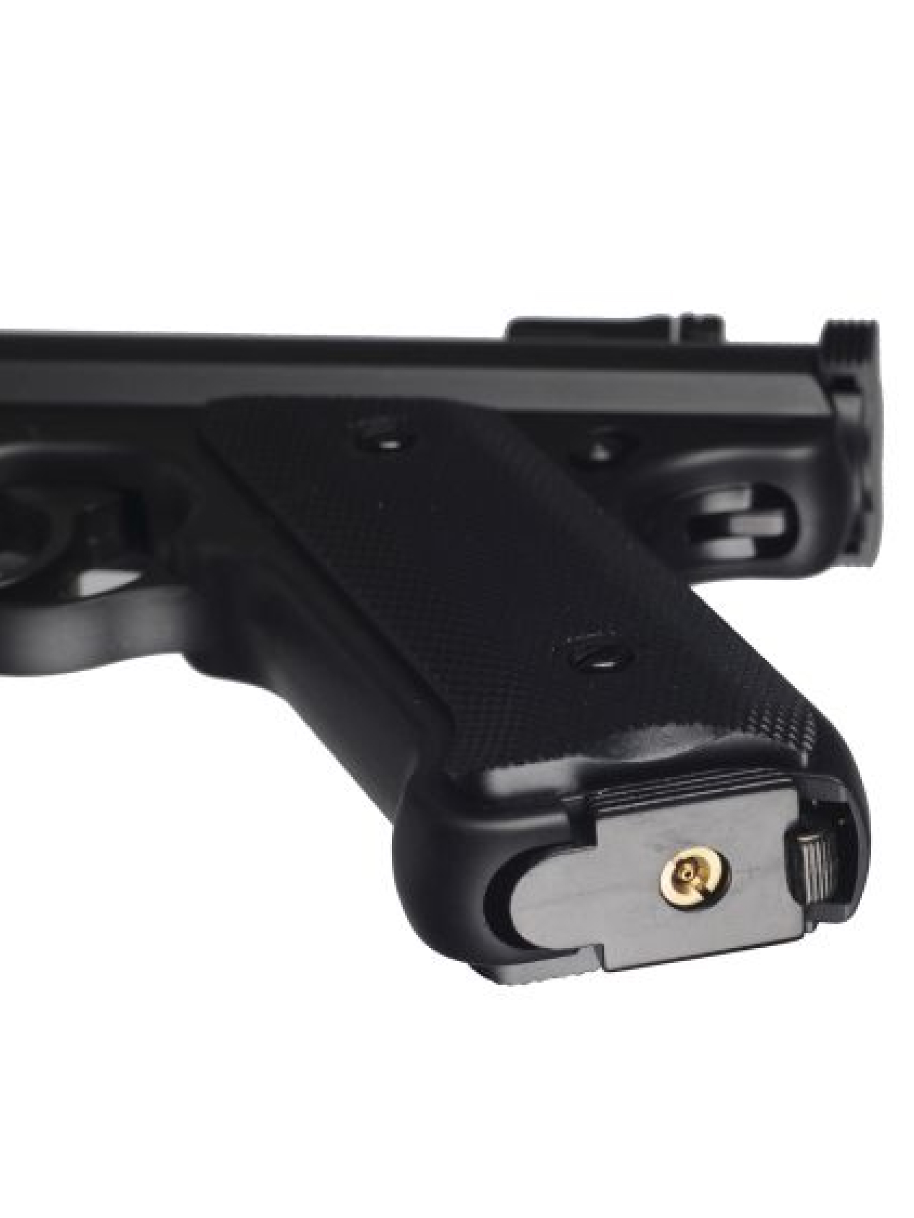 KJW Ruger MK1 работает на Green Gas, обеспечивая дульную энергию до 1,7 Дж и впечатляющую скорость выстрела – 120-130 м/с. Это гарантирует уверенную дальность и точность попадания. Пистолет использует пластиковые шары калибра 6 мм, а магазин вмещает 17 шариков, позволяя вести длительный огонь без частой перезарядки.