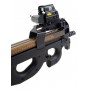Благодаря установке направляющей Пикатинни возможности данной модели можно увеличить за счет коллиматорного прицела. Механические прицельные приспособления здесь не предусмотрены. Основной материал изготовления Cyma FN P90 – пластик ABS, часть компонентов выполнена из сплава алюминия.
