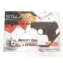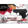Пистолет Сталкер СА25 Спринг взводится вручную путем оттягивания подвижного затвора в крайнее положение. Пружина, распрямляясь, придает боеприпасу ускорение, необходимо для выстрела. Стреляет пистолет шариками 6 мм, его магазин позволяет разместить 6 боеприпасов. Скорость выстрела – 80 м/с. Мощность оружия составляет 0,7 Дж, что дает возможность свободной его реализации.
