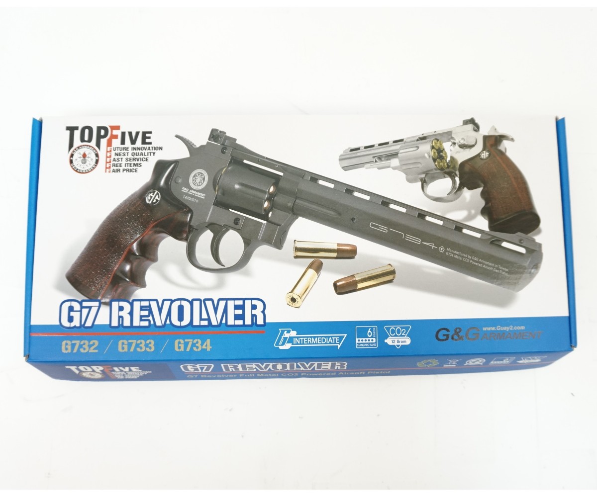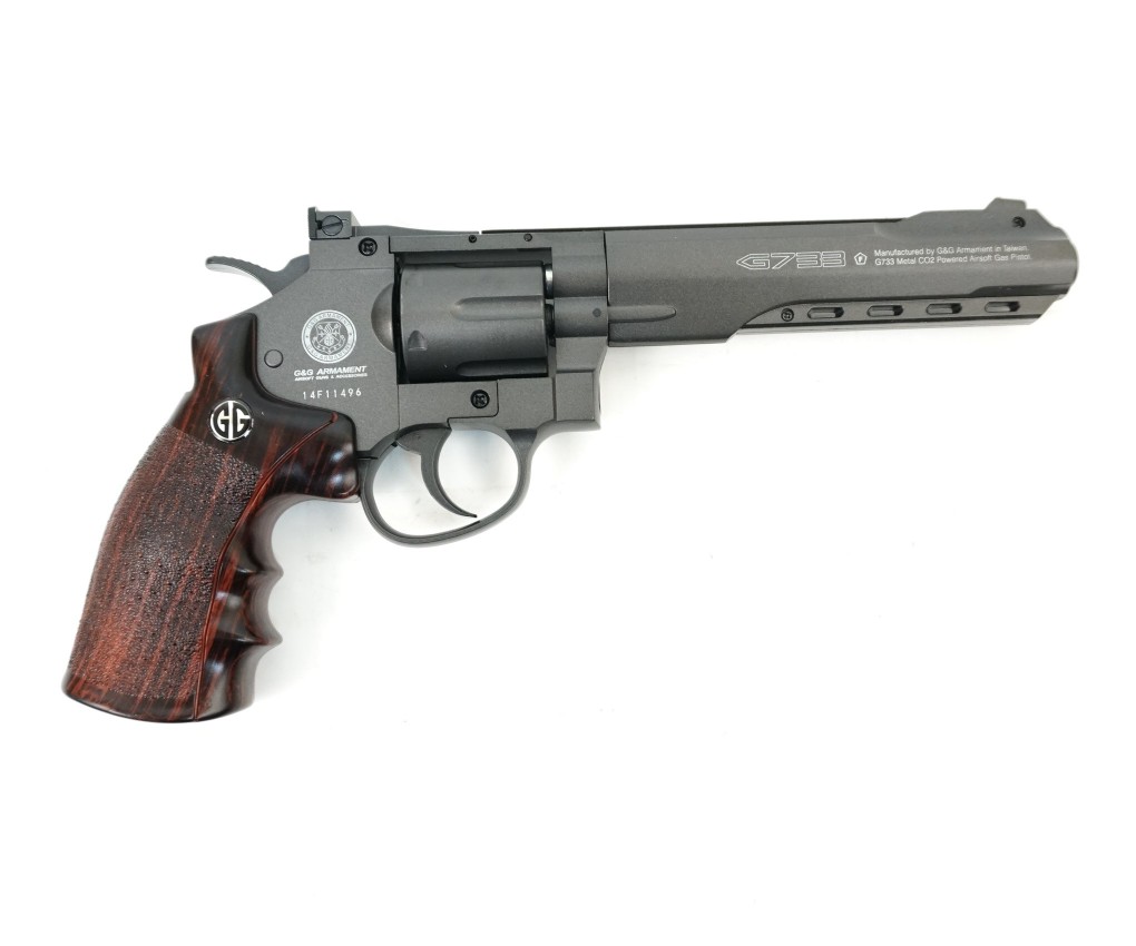 Револьвер G&G G733 BK, имеющий корпус из алюминия и пластиковую рукоять, использует в качестве привода двуокись углерода CO2. Порция газа выбрасывает из ствола шарик со скоростью 115-120 м/сек. Шарики снаряжаются в боеприпасы, имитирующие боевые патроны.