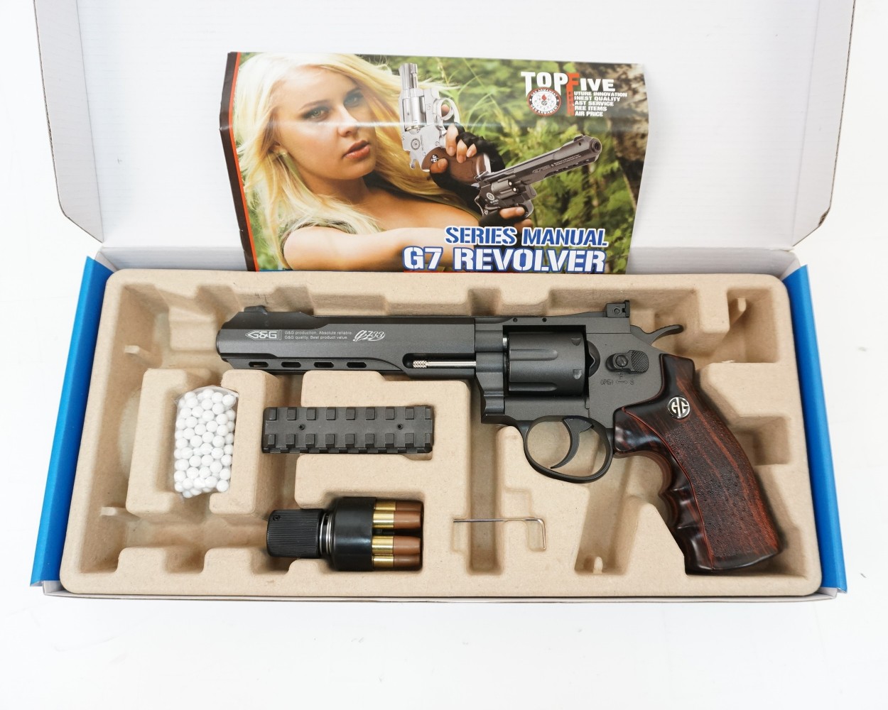 Хоп-ап револьвера не регулируется. Внешний вид изделия практически полностью повторяет боевой аналог, и даже органы управления его частично имеют такие же функции. Предохранитель расположен слева.
