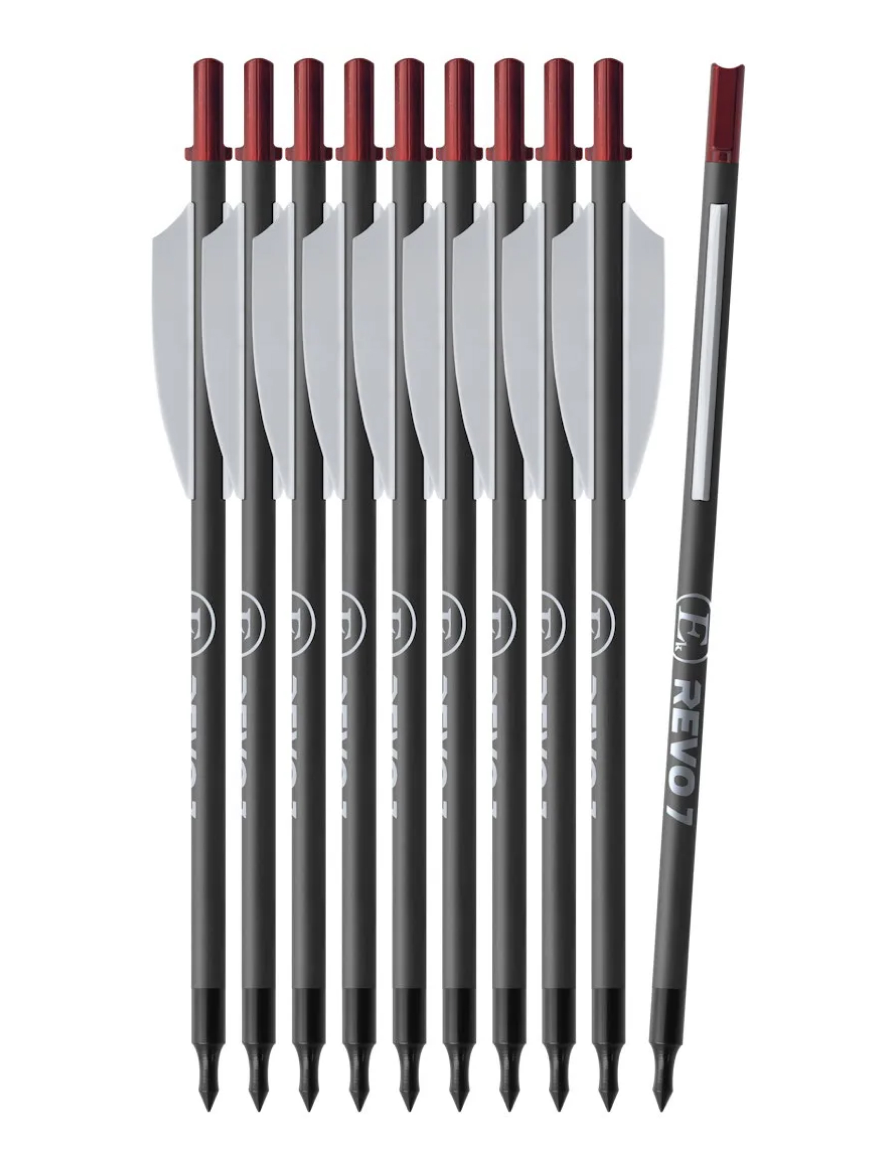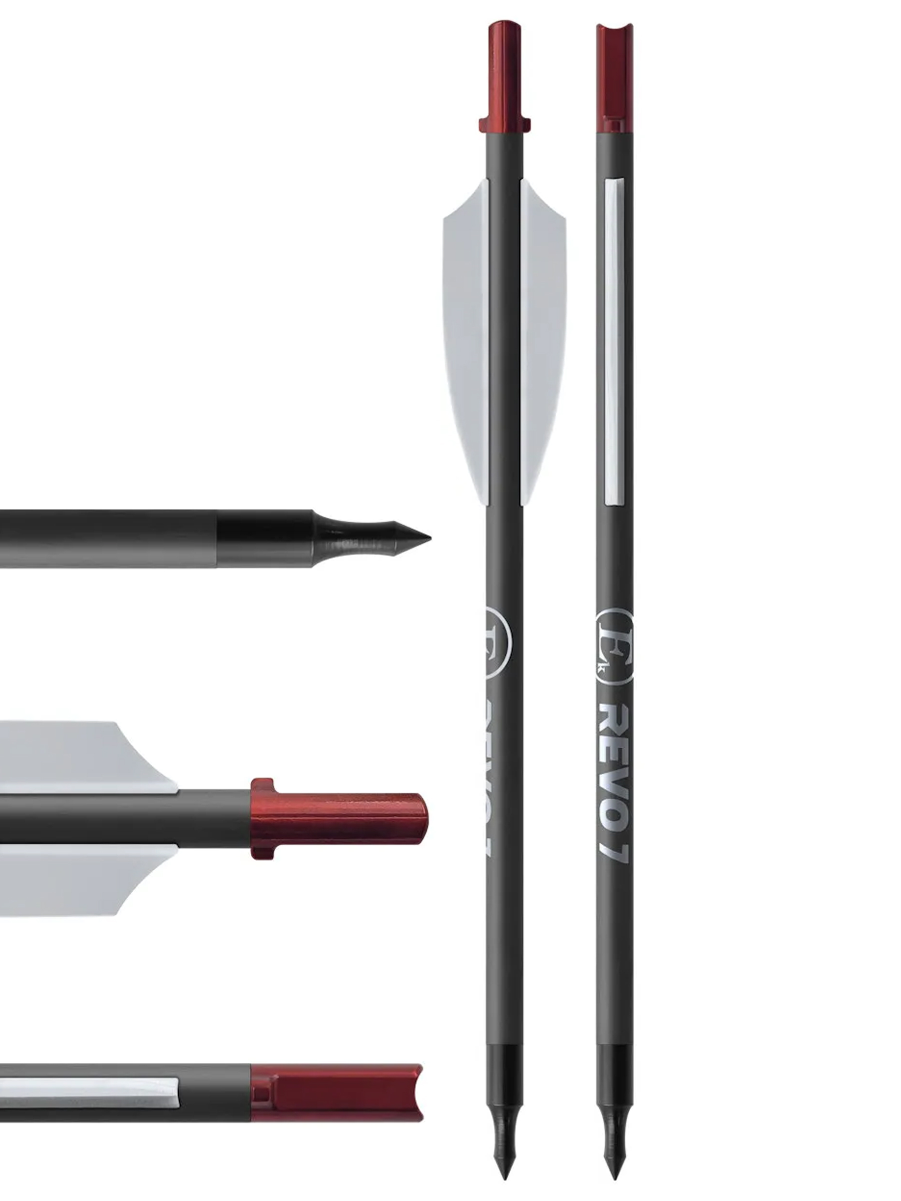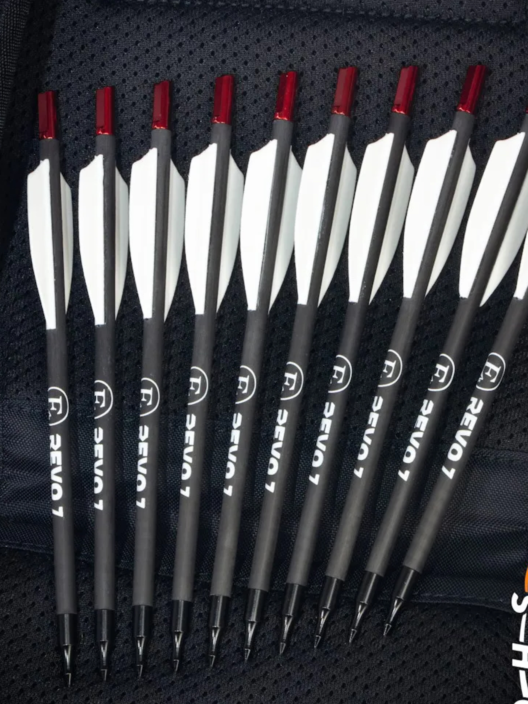 Стрелы используется с тактическим многозарядным арбалетом Ek Archery Revo-7. Это специальные дротики толщиной 5.5 мм, предназначенные для скоростной стрельбы. Дротик выполнен из 100% карбона, имеет двойное резиновое оперение, вогнутый алюминиевый хвостовик и утяжеленный стальной наконечник. Стрелы для Revo-7 можно ремонтировать, и при корректном использовании они прослужат очень долго.