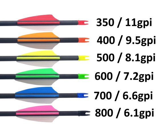 Опционально стрелы можно комплектовать спортивными хвостовиками, устанавливаемыми на алюминиевые пины. Линейка спайна (жесткости) варьируется от 350 до 800, что позволит подобрать стрелу под любую растяжку и силу натяжения. Для удобства различия стрел по спайну, каждый вид стрел оснащается своим цветом оперения и хвостовика.