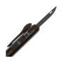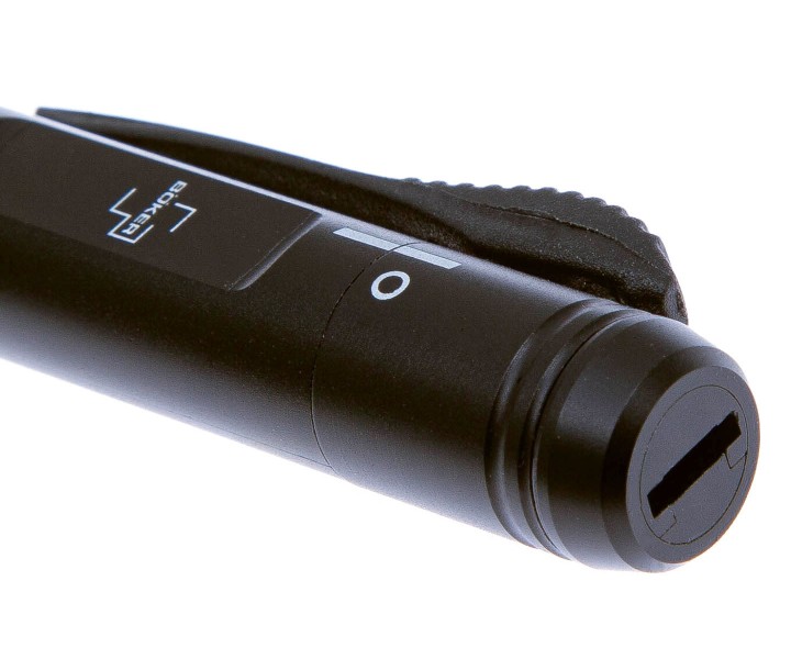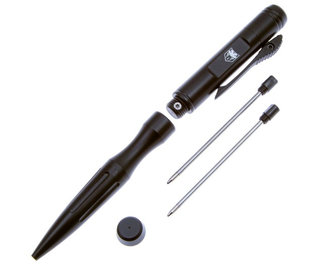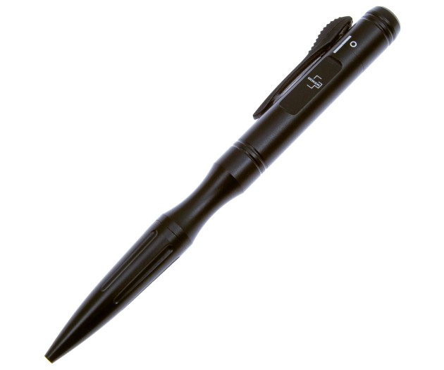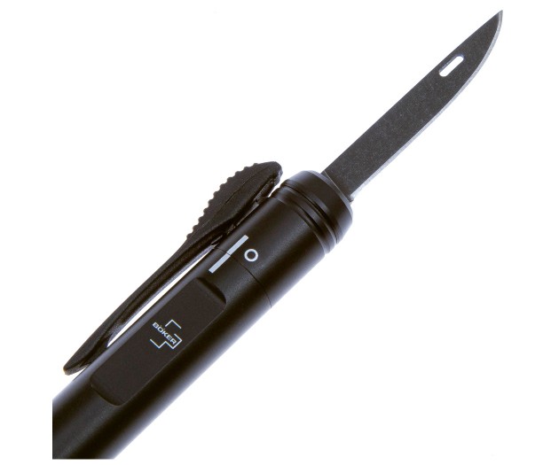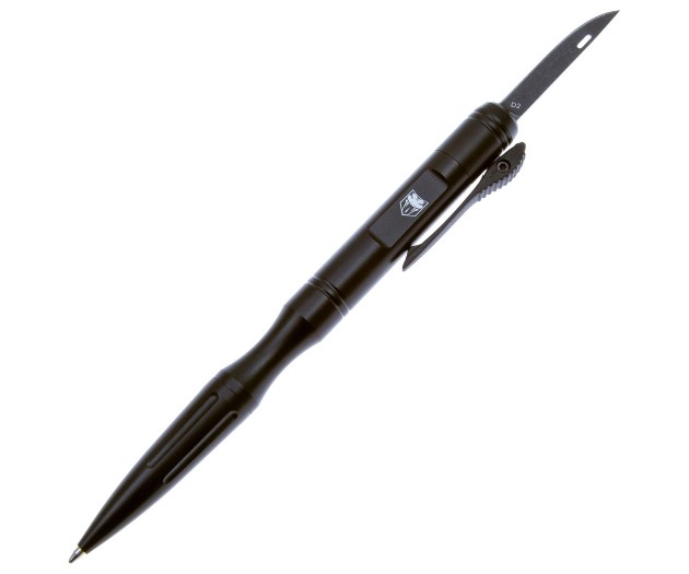 Клинок из стали D2 находится с тыльной стороны ручки и для его высвобождения необходимо нажать на клипсу. Для того чтобы использовать ручку по её прямому назначению, достаточно просто повернуть корпус и выдвинуть стержень. Ручка имеет прочный алюминиевый корпус.