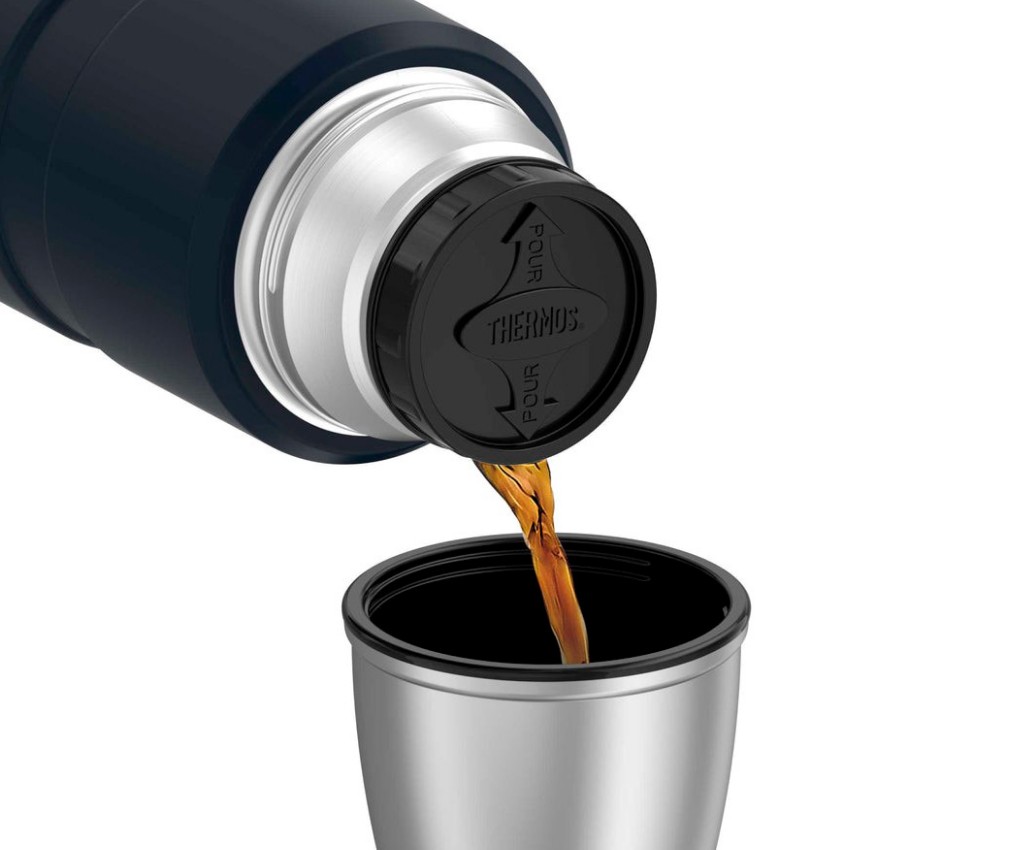 Термос имеет удобную крышку-чашку и винтовую пробку с направляющими для выливания напитков. Чтобы налить напиток в чашку, достаточно повернуть пробку на пол-оборота и не выкручивать её полностью. На верхней стороне пробки предусмотрены указатели потока жидкости. Складная ручка с надёжным металлическим креплением добавляет удобства при переноске термоса.