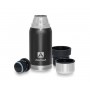 Термос с узким горлом и глухой пробкой, 2 накручивающиеся чашки в комплекте. Молотковая эмаль на корпусе дополнительно защищает термос от сколов и царапин. Объем 0,5 л. компактный размер.