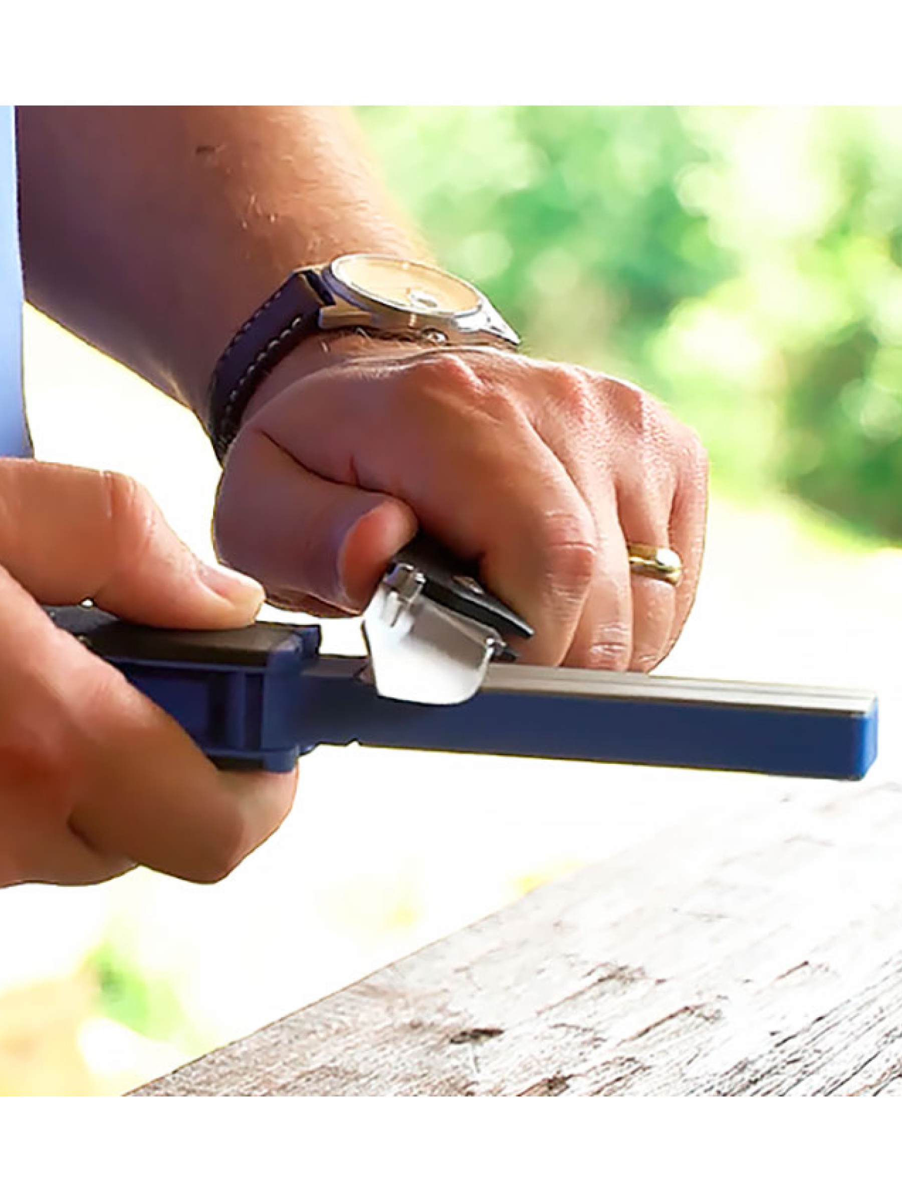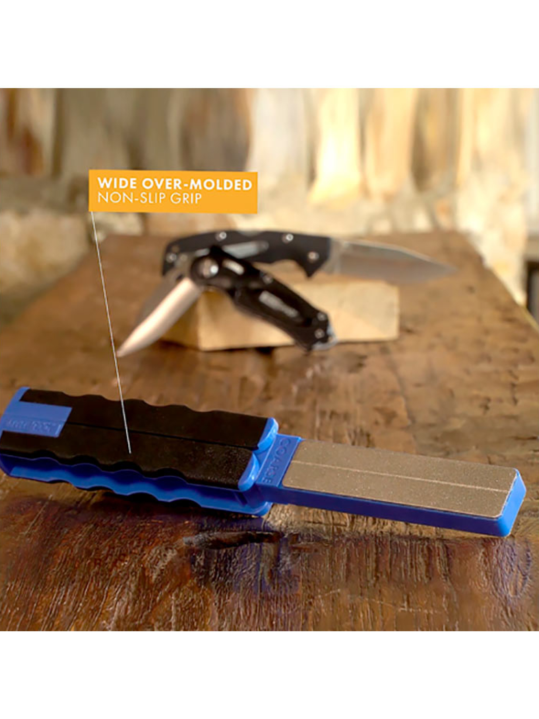 Точилка позволяет быстро поправить нож на весу: для заточки необходимо выдерживать угол вручную. Брусок имеет алмазное напыление с зернистостями 320 с одной стороны и 600 с другой. Рукоять складная, эргономичная, из нескользящего материала, брусок складывается внутрь между плашек.