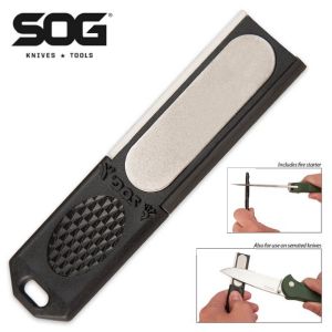 В модели SOG SG_SH-03 содержится алмазная точилка для ножей, стержень из керамики для заточки серрейторных лезвий, а также ферросплавное огниво с магнием. Комплект поставки поставляется в фирменной упаковке. Такой инструмент подойдет не только для активного отдыха, но и применения на даче и даже в городе. Экстремалы смело включают его в свой набор для выживания и отправляются на поиски приключений, просто положив его к себе в карман. Небольшие размеры, легкий вес и возможность быстро приступить к использованию точилки с огнивом делают SOG SG_SH-03 еще более привлекательным в глазах ценителей полезных вещей.