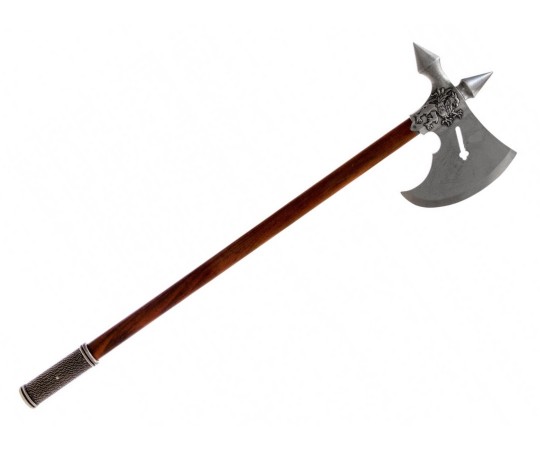 Изделие выполнено из металлического сплава, имеет сверху вертикальное лезвие и пику с противоположной стороны топора. Рукоятка изготовлена из натурального дерева, на ее конце установлен металлический наконечник. Лезвие топора украшено изображением гербового животного. За счет отсутствия заточки лезвия такой топор будет полностью безопасным изделием. Вес изделия 0,93 кг, длина 70 см.