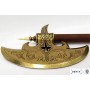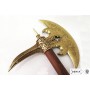 Топор боевой, латунь (Германия, XVI век) DE-5602 – это эффектное изделие из серии исторического холодного оружия эпохи Средневековья. Боевые топоры являлись версией рабочих топоров дровосеков, при этом были более легкими и обладали очень острым лезвием. Кавалеристы германской армии использовали такие топоры в основном для вбивания в щит противника и обеспечения потери им защиты.