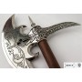 Боевой топор германцев использовался как оружие против щитов противника, пробитый щит делал врага более легкой добычей. При изготовлении топора использован металлический сплав с никелем, придающий изделию эффектный вид. Лезвие фигурное, с имитацией инкрустации по металлу. Черенок из натуральной древесины, на его конце имеется металлический наконечник. Обратная сторона топора (обух) имеет пику, которую использовали в бою для пробивания брони.