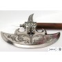 Топор боевой, никель (Германия, XVI век) DE-6602 – это изделие оригинального внешнего вида от специалистов испанской компании Denix. Топор выполнен на основе реального боевого прототипа, такие топоры широко использовались кавалерией Германии в период средних веков. Боевой топор отличается не только фигурным лезвием, но и наличием с обратной стороны лезвия пики. Назначение пики – пробивание брони противника.