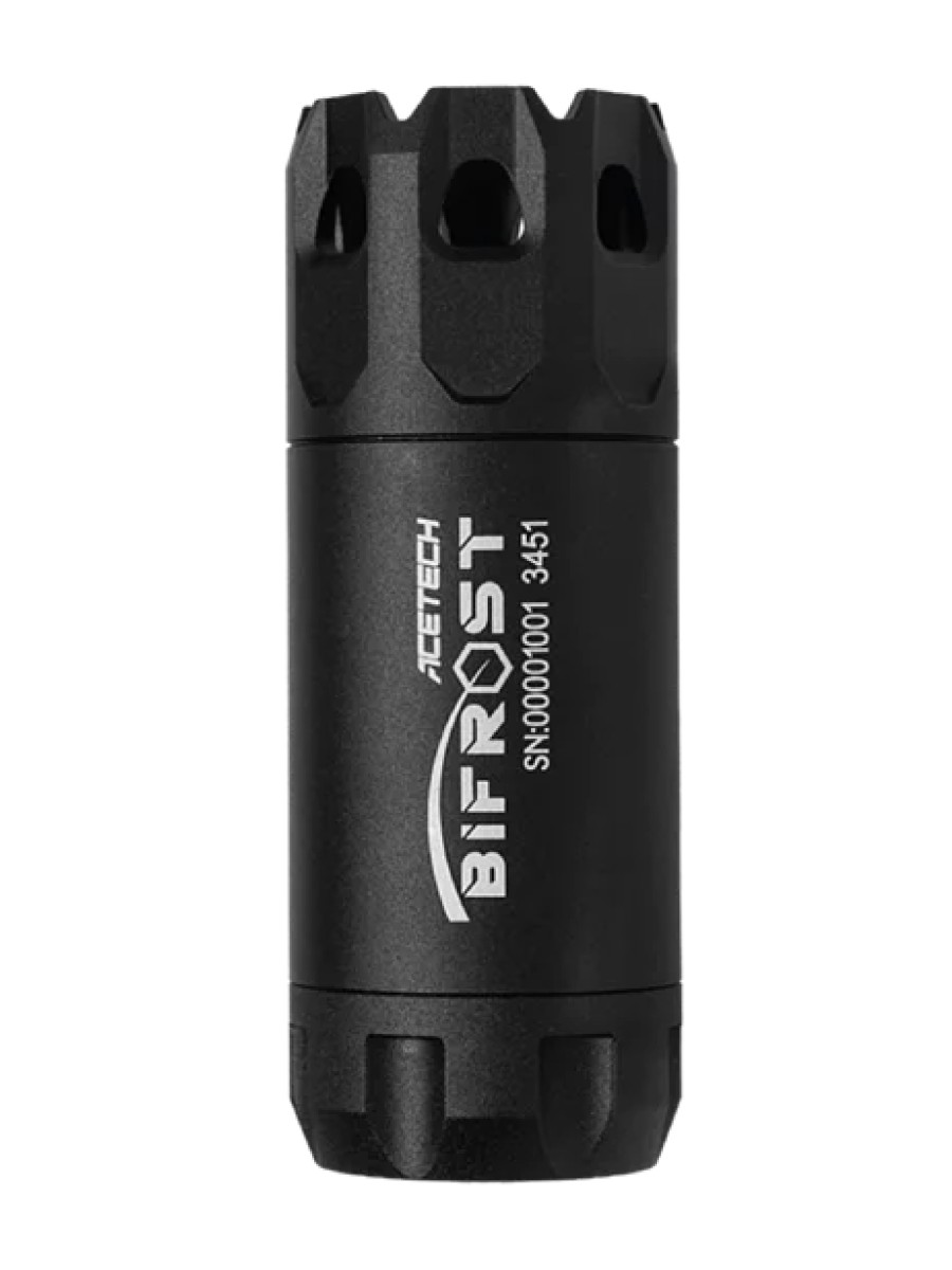 Прочный корпус насадки изготовлен из алюминия, обеспечивая надежность и долговечность. Установка осуществляется на резьбу 14- (CCW), а комплектный переходник позволяет использовать насадку и с приводами, имеющими резьбу 11+ (CW). Bifrost поддерживает высокую скорострельность до 35 выстрелов в секунду. Внутри установлен литий-полимерный аккумулятор, заряжаемый через удобный разъем USB Type-C, расположенный на корпусе.