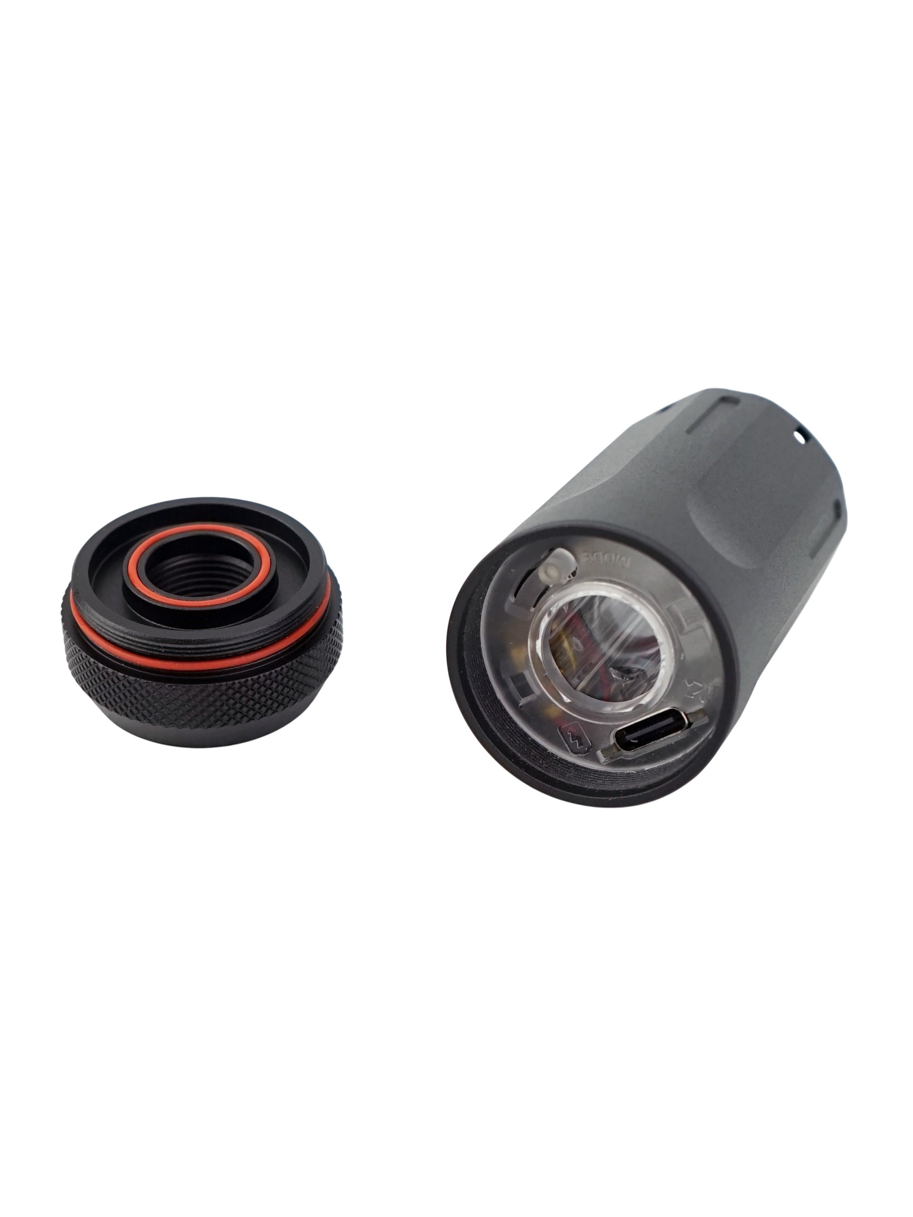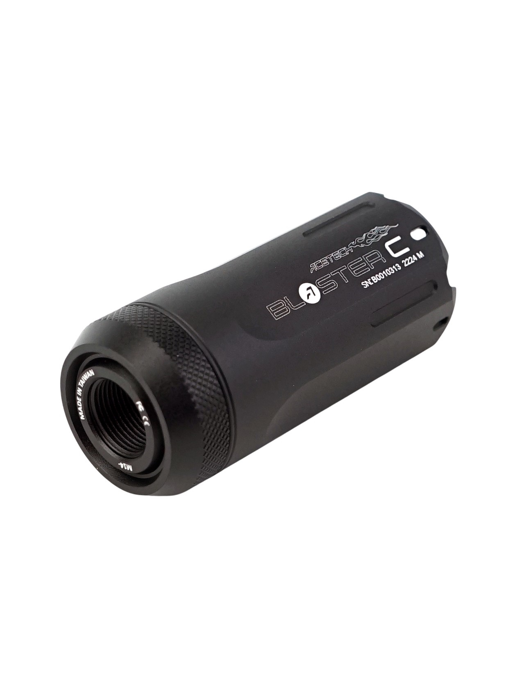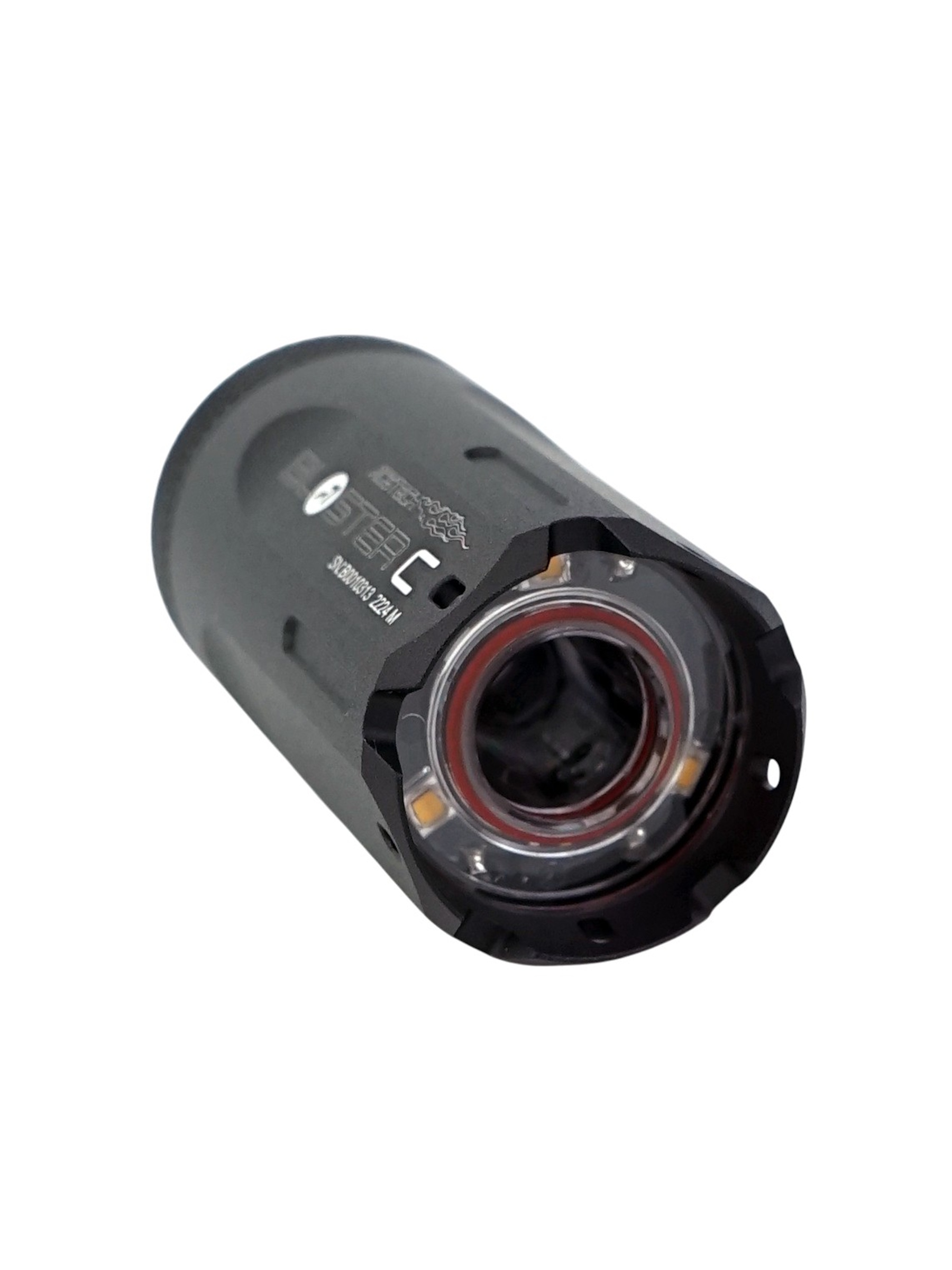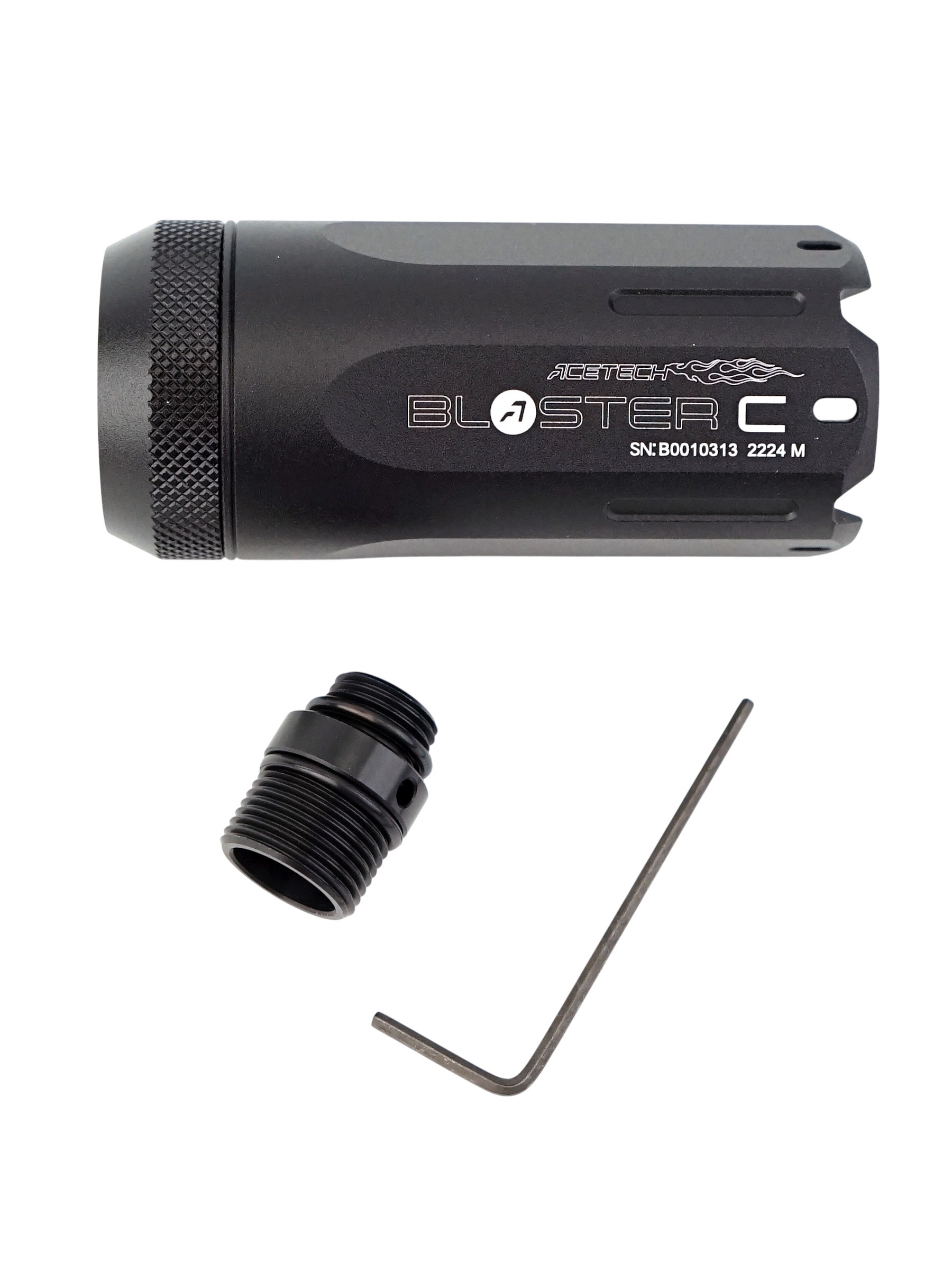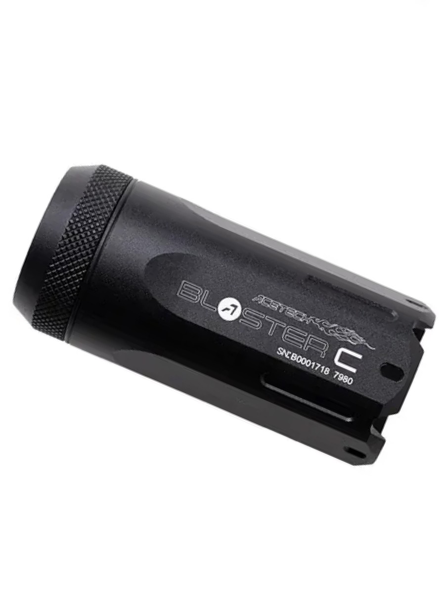Blaster C оснащен надежным корпусом с защитой от пыли и влаги по стандарту IP65. Насадка имеет стандартную резьбу 14- (CCW) и комплектуется адаптером на 11+ (CW), что обеспечивает совместимость с широким спектром страйкбольного оружия.