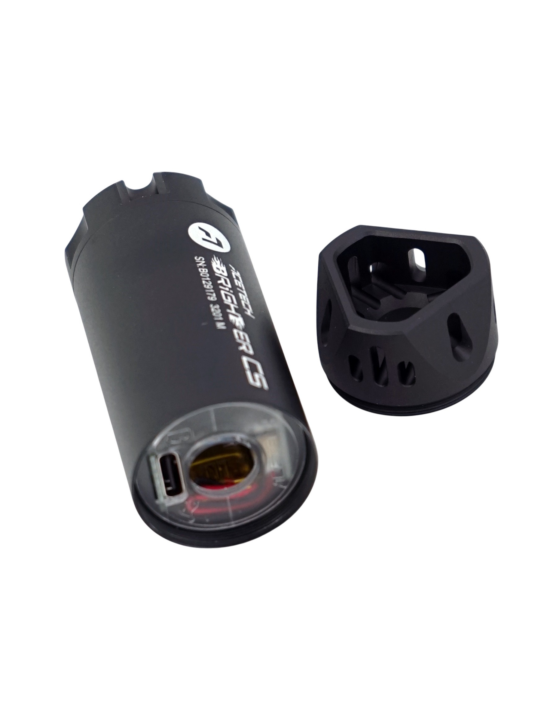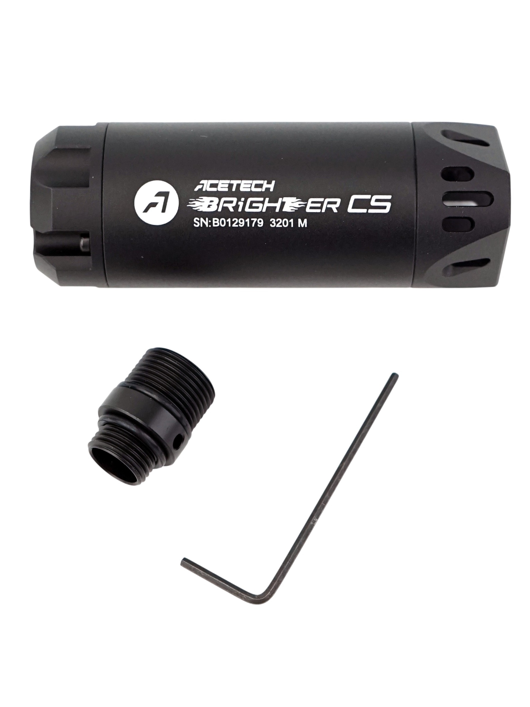 Brighter CS предназначен для работы исключительно с зелеными трассерными шарами, обеспечивая превосходную подсветку даже при скорострельности до 35 выстрелов в секунду. Встроенный аккумулятор гарантирует до 20 000 выстрелов на одной зарядке, которая производится через современный разъем USB Type-C (кабель и адаптер питания приобретаются отдельно). Для установки на большинство страйкбольных приводов предусмотрена стандартная резьба М14- (CCW, против часовой стрелки). В комплекте также поставляется адаптер на резьбу М11+ (CW, по часовой стрелке), обеспечивающий совместимость с широким спектром моделей оружия.