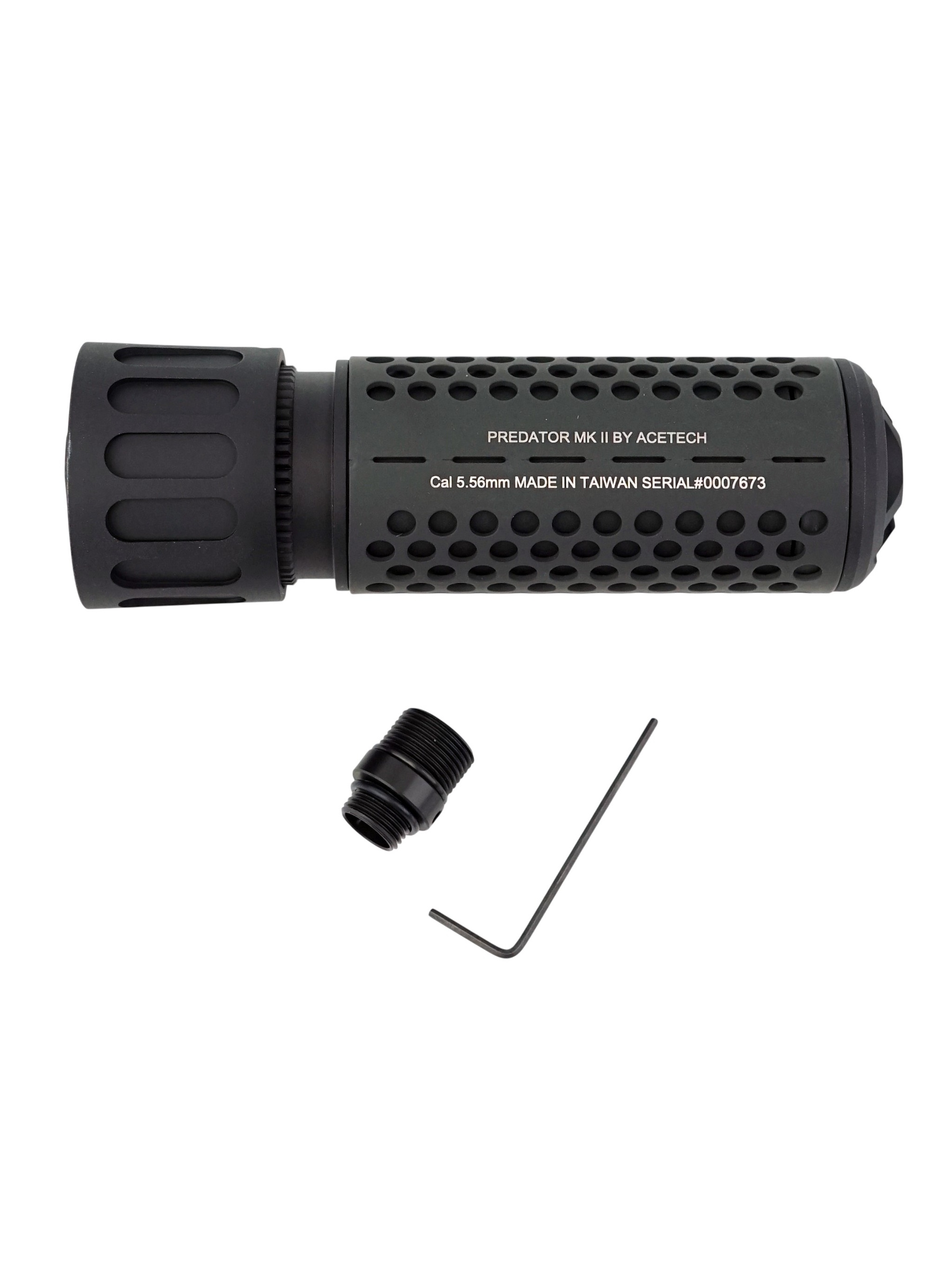 Predator MKII готов к работе с вашим оружием, поддерживая высокую скорострельность до 35 выстрелов в секунду. Он легко устанавливается на страйкбольные приводы с резьбой M14- CCW. В комплекте также идет адаптер (с M14 CCW на M11 C), расширяющий возможности установки.