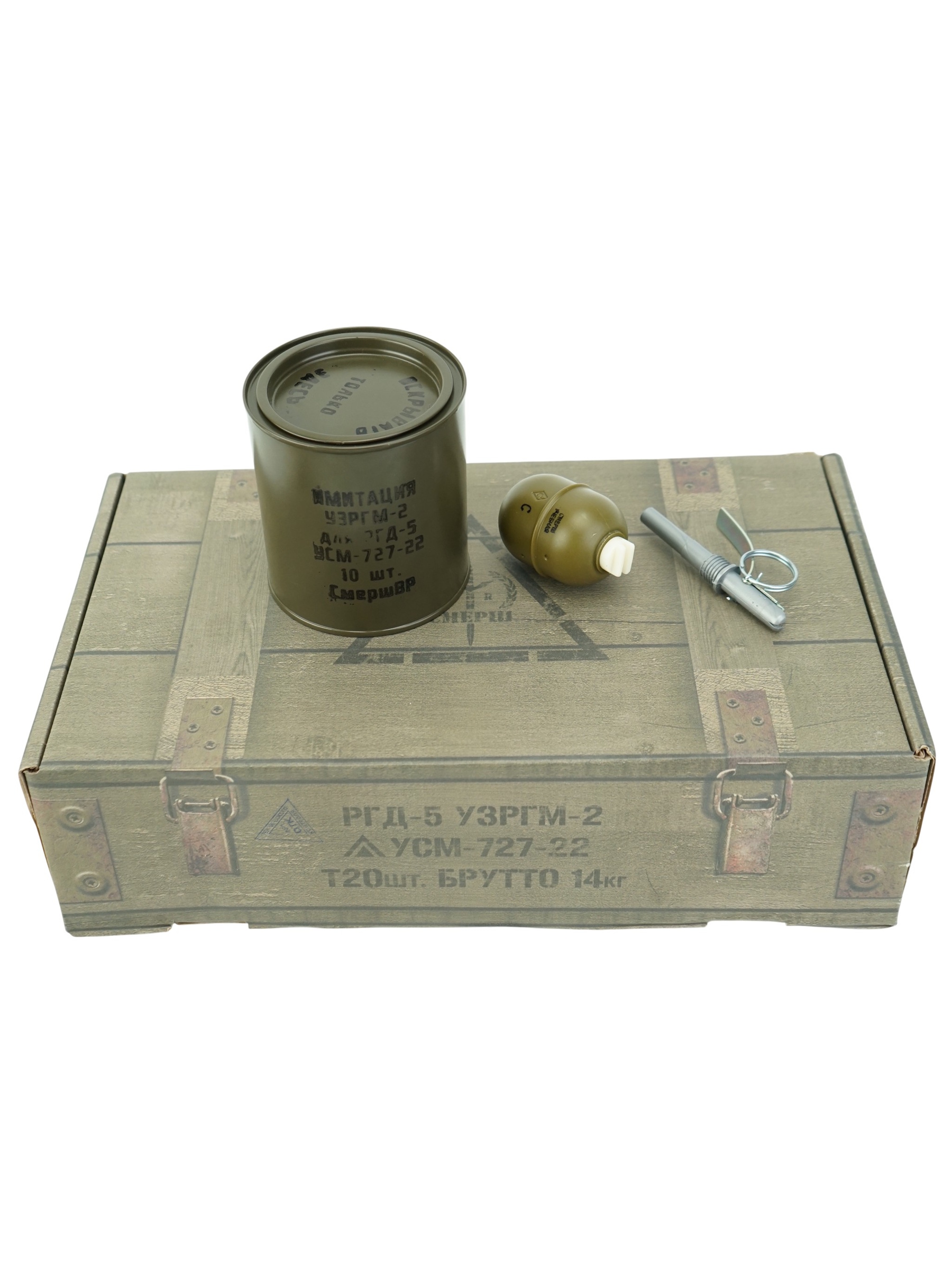 Имитация запала УЗРГМ с металлическим предохранительным рычагом, его снаряжение в корпус гранаты по средствам вкручивания, так же соответствуют высокому уровню копийности с боевым аналогом. Так же воспроизведен полный алгоритм приведения данных гранат к бою, а именно воссоздан внешний вид ящика и внутреннего расположения комплектующих данных гранат, принципы хранения узлов и их упаковки. Полностью повторяет внешний вид и действие боевого образца. Предохранительный рычаг из металла с аутентичными маркировками, печатями даты производства активный, время замедления как у боевого аналога.