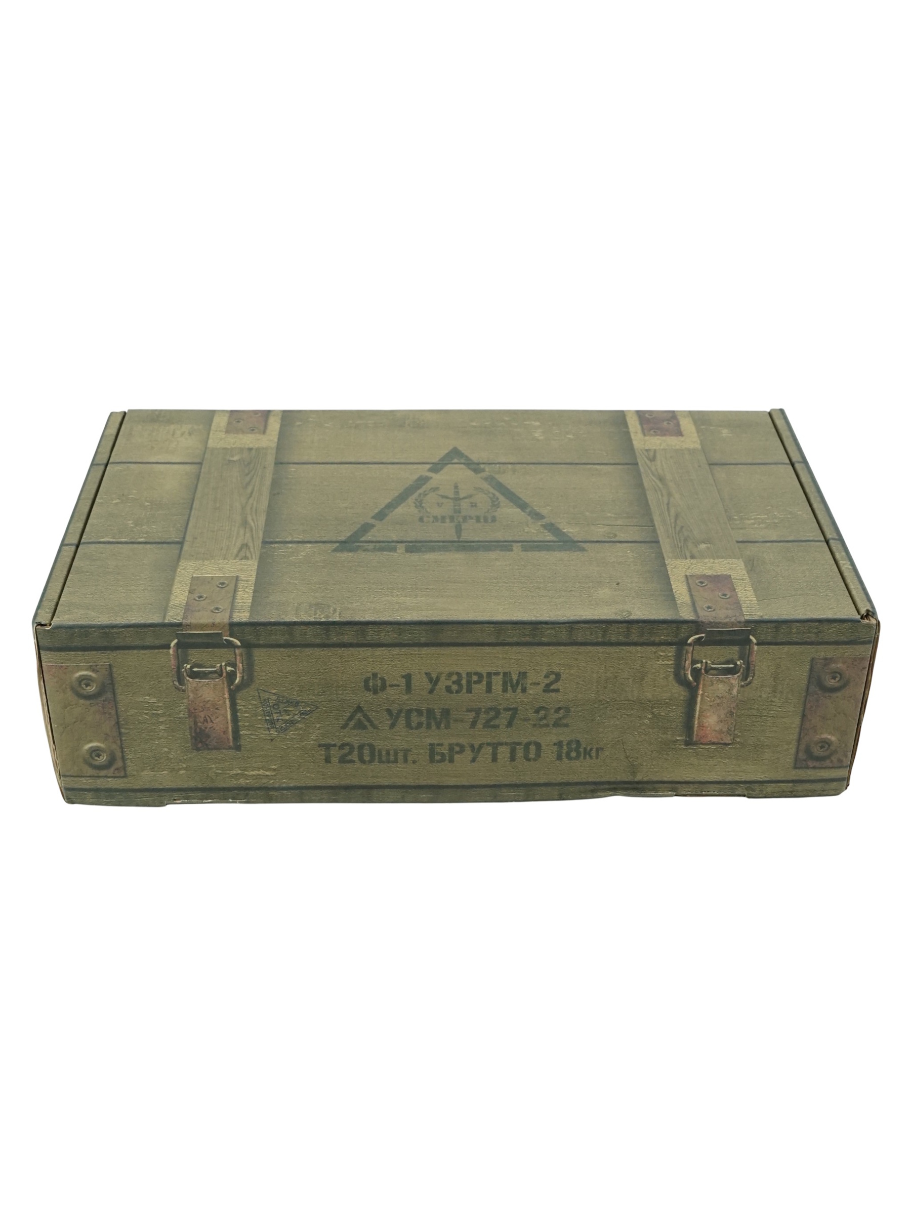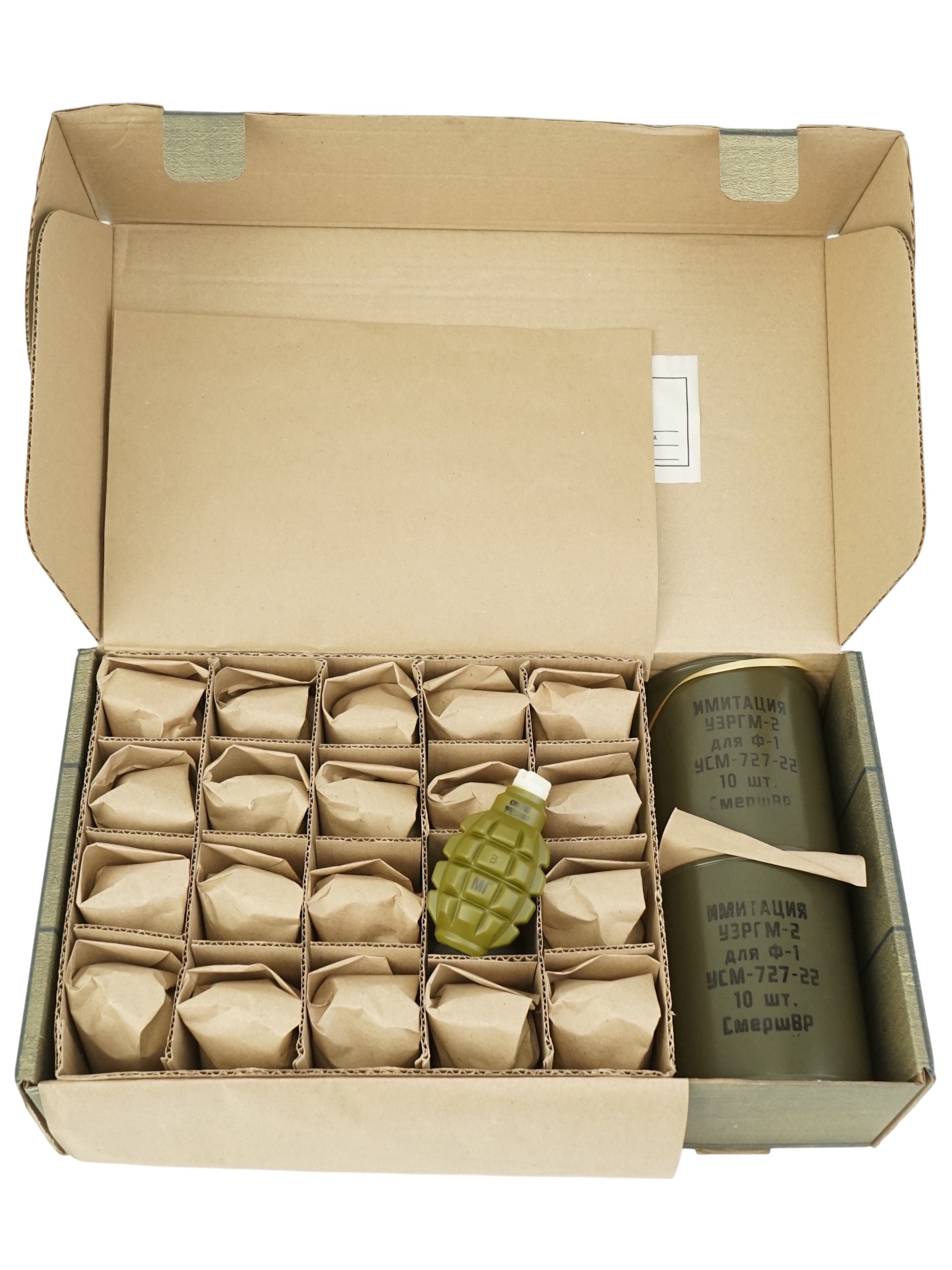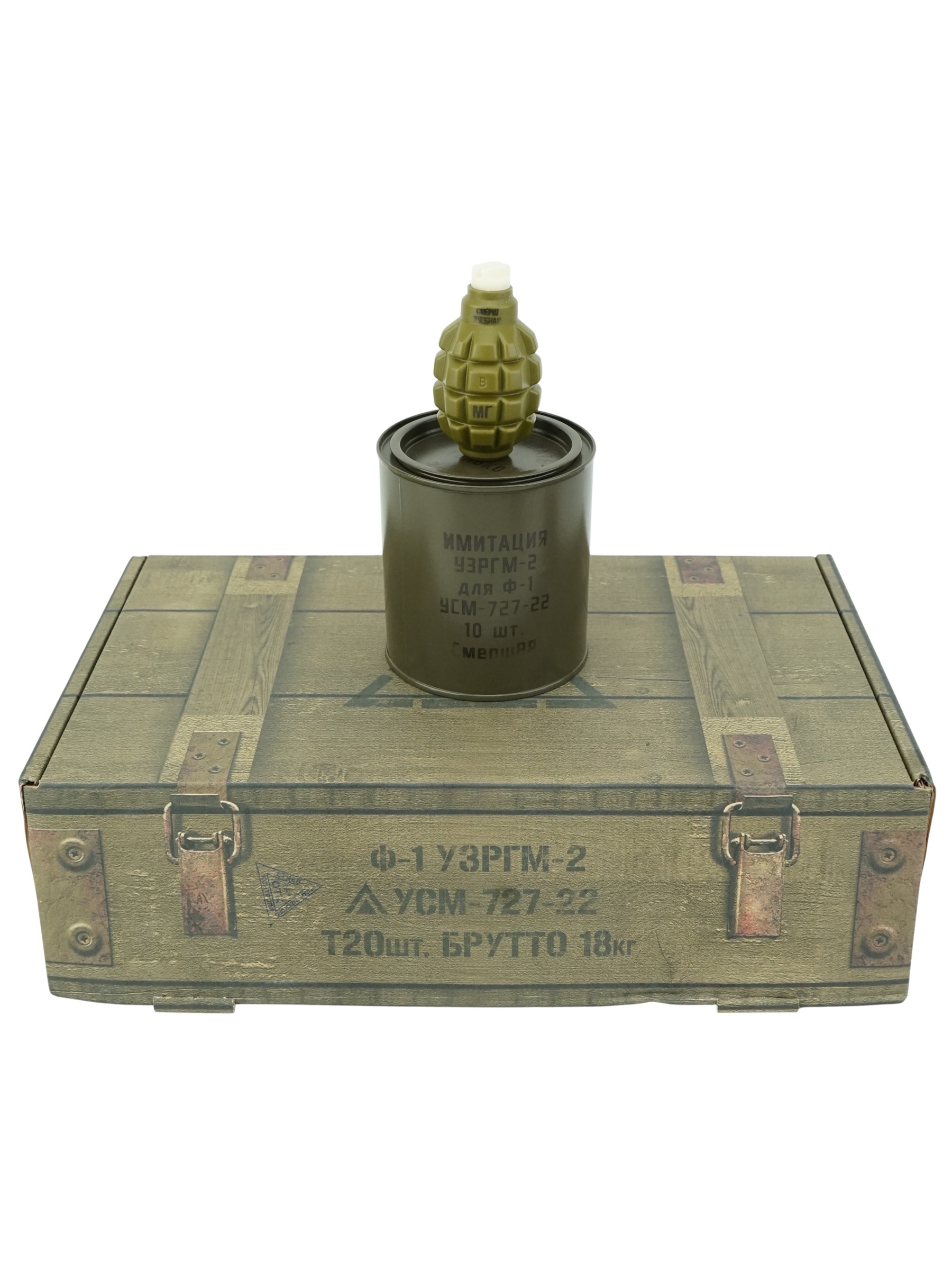 Имитация запала УЗРГМ с металлическим предохранительным рычагом, его снаряжение в корпус гранаты по средствам вкручивания, так же соответствуют высокому уровню копийности с боевым аналогом. Так же воспроизведен полный алгоритм приведения данных гранат к бою, а именно воссоздан внешний вид ящика и внутреннего расположения комплектующих данных гранат, принципы хранения узлов и их упаковки. Полностью повторяет внешний вид и действие боевого образца. Предохранительный рычаг из металла с аутентичными маркировками, печатями даты производства активный, время замедления как у боевого аналога.
