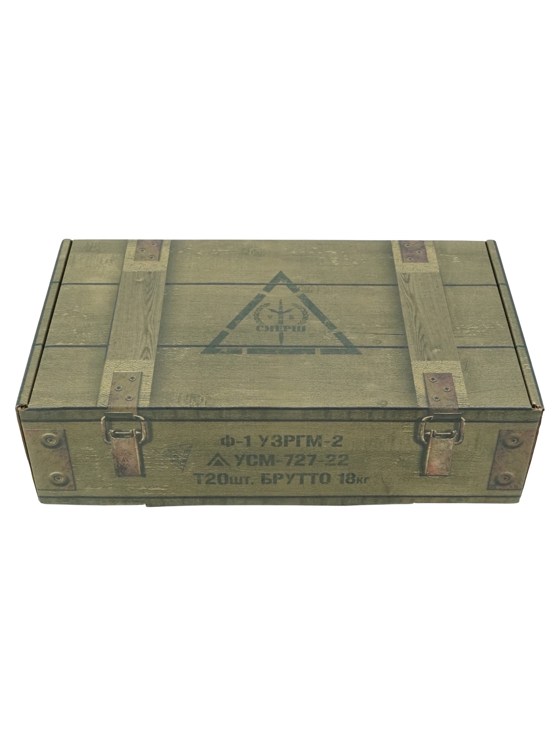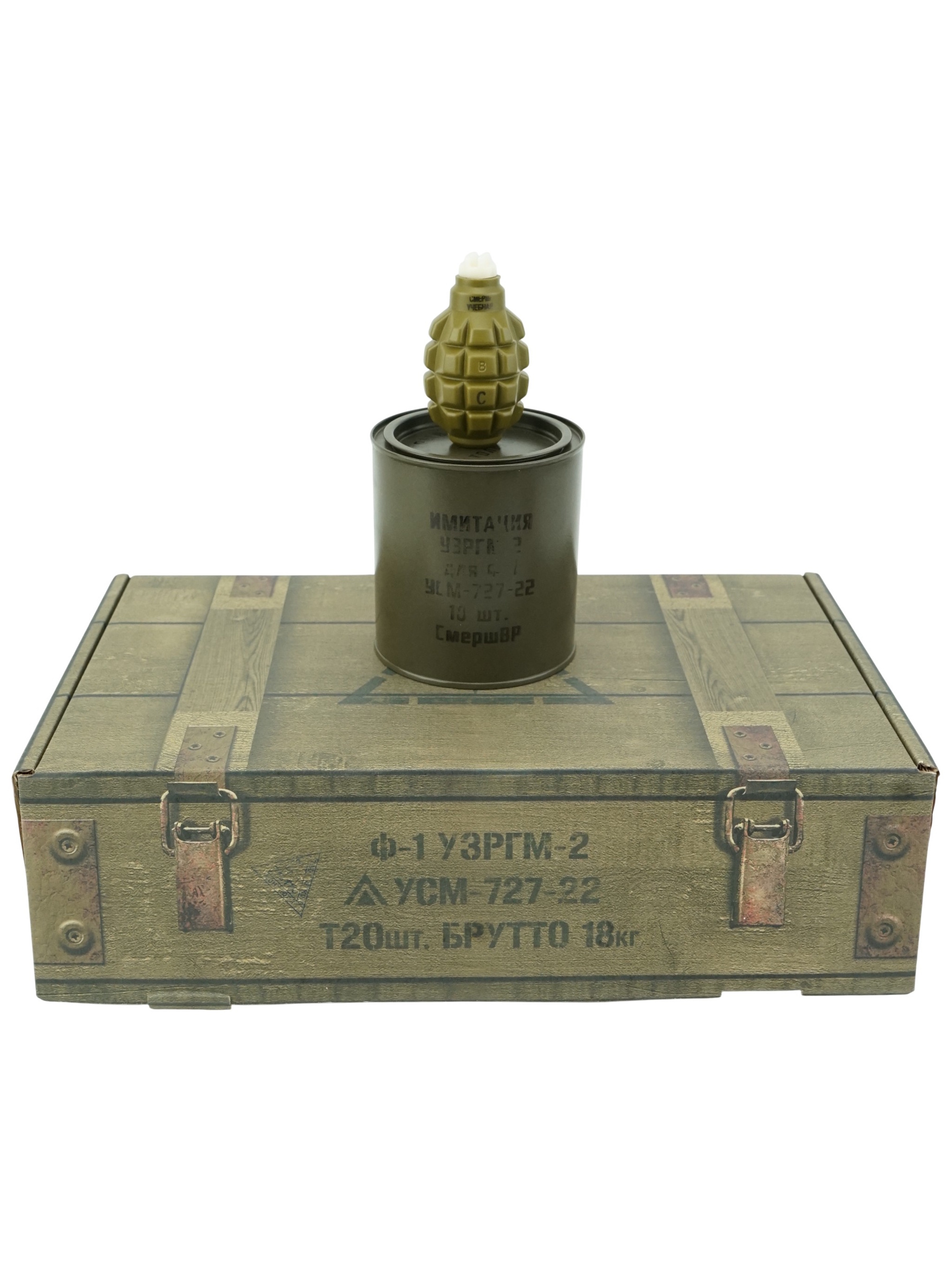 Имитация запала УЗРГМ с металлическим предохранительным рычагом, его снаряжение в корпус гранаты по средствам вкручивания, так же соответствуют высокому уровню копийности с боевым аналогом. Так же воспроизведен полный алгоритм приведения данных гранат к бою, а именно воссоздан внешний вид ящика и внутреннего расположения комплектующих данных гранат, принципы хранения узлов и их упаковки. Полностью повторяет внешний вид и действие боевого образца. Предохранительный рычаг из металла с аутентичными маркировками, печатями даты производства активный, время замедления как у боевого аналога.