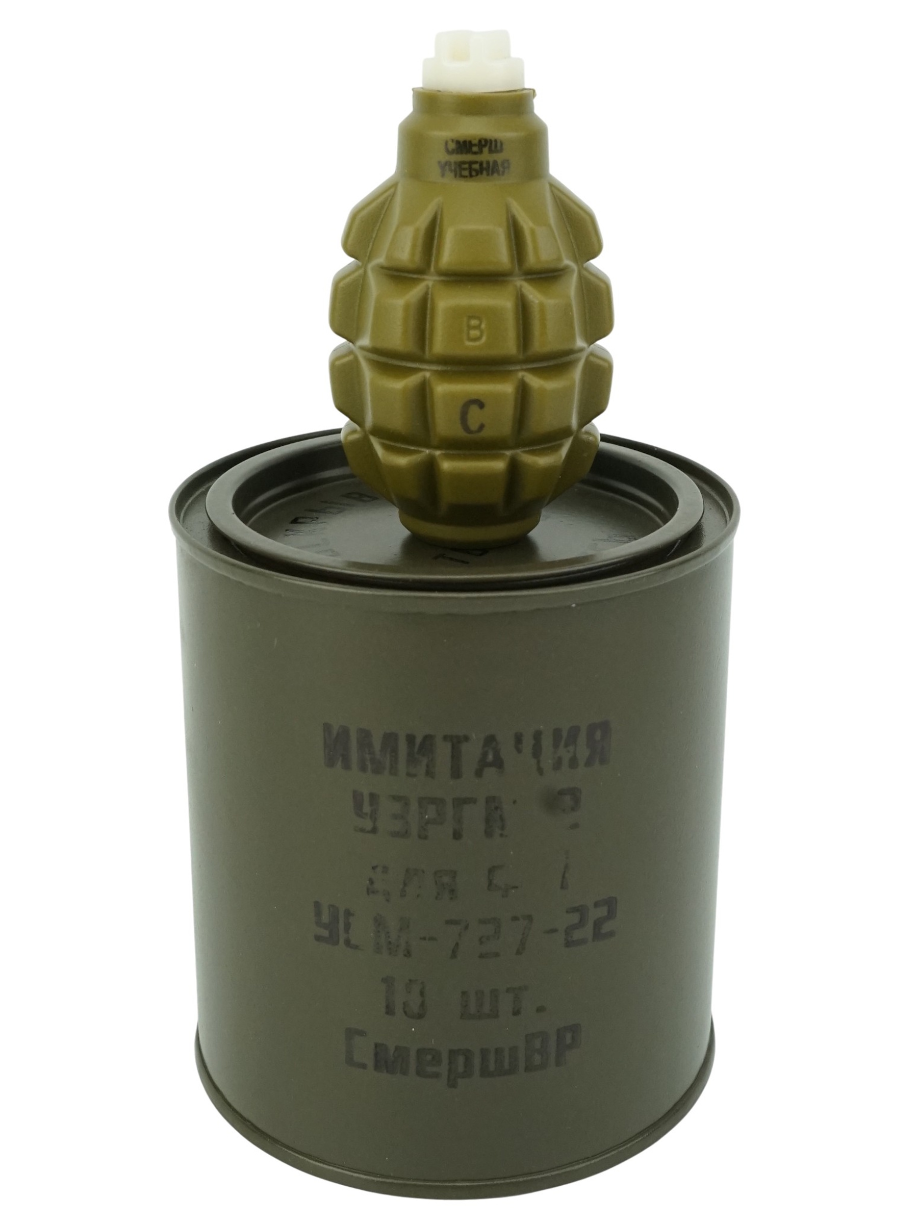Учебная пиротехническая граната СМЕРШ ВР Ф-1(С), предназначена для использования в качестве учебного пособия при учебной практике навыкам обращения с боевыми ручными гранатами, может использоваться при проведении военно-спортивных игр (пейнтбол или страйкбол), а также при проведении военно-исторических реконструкций и тренировок силовых структур.