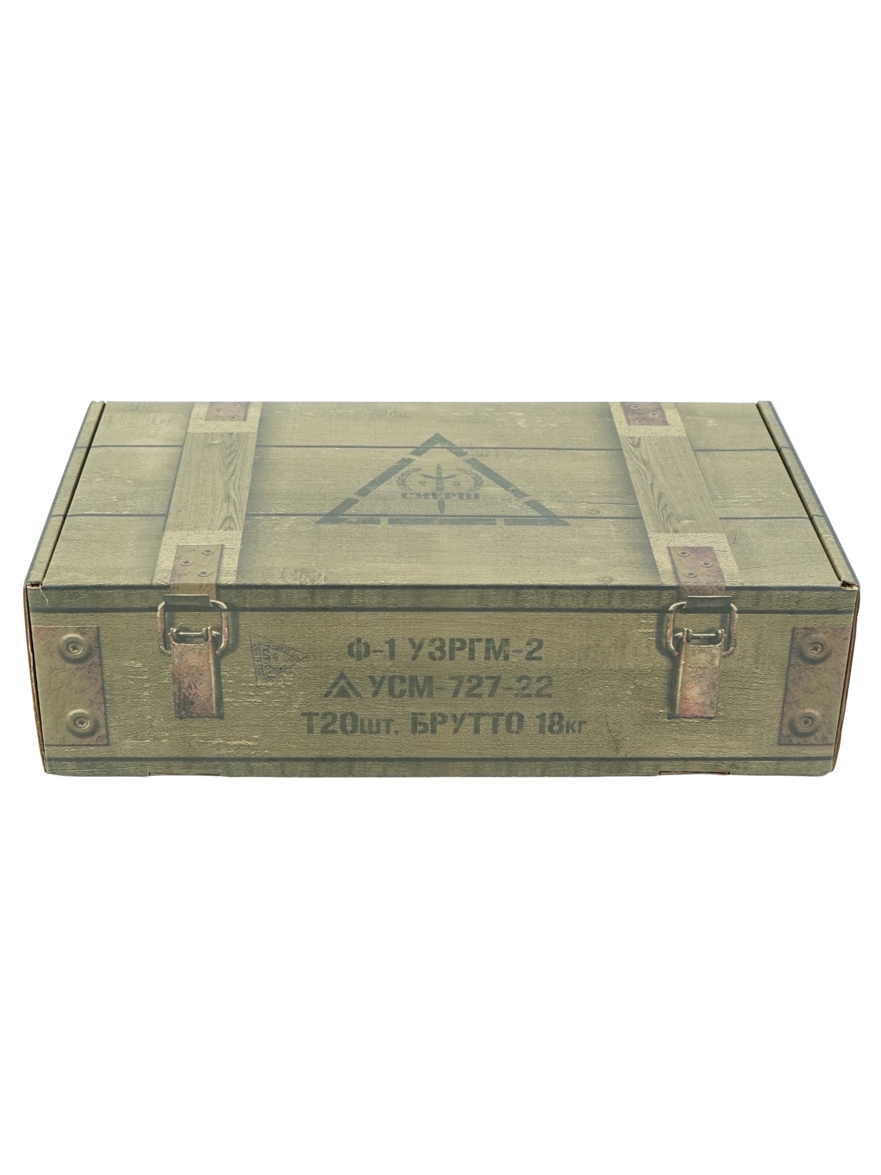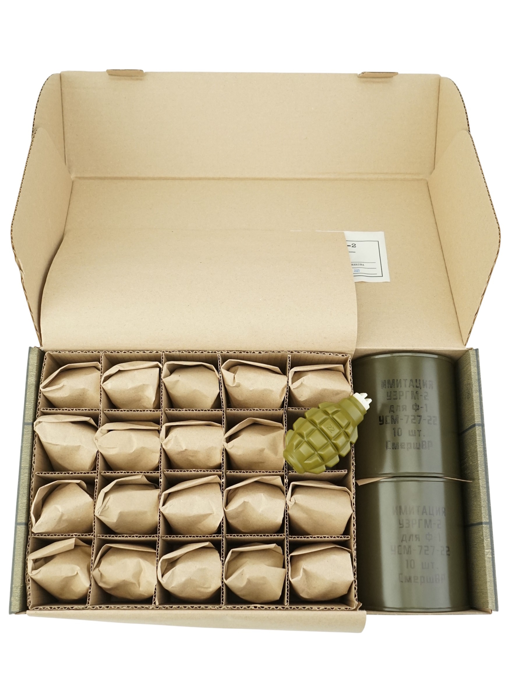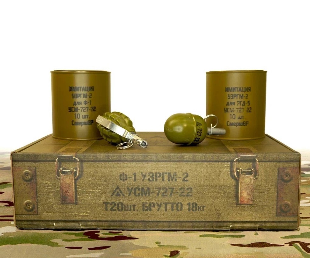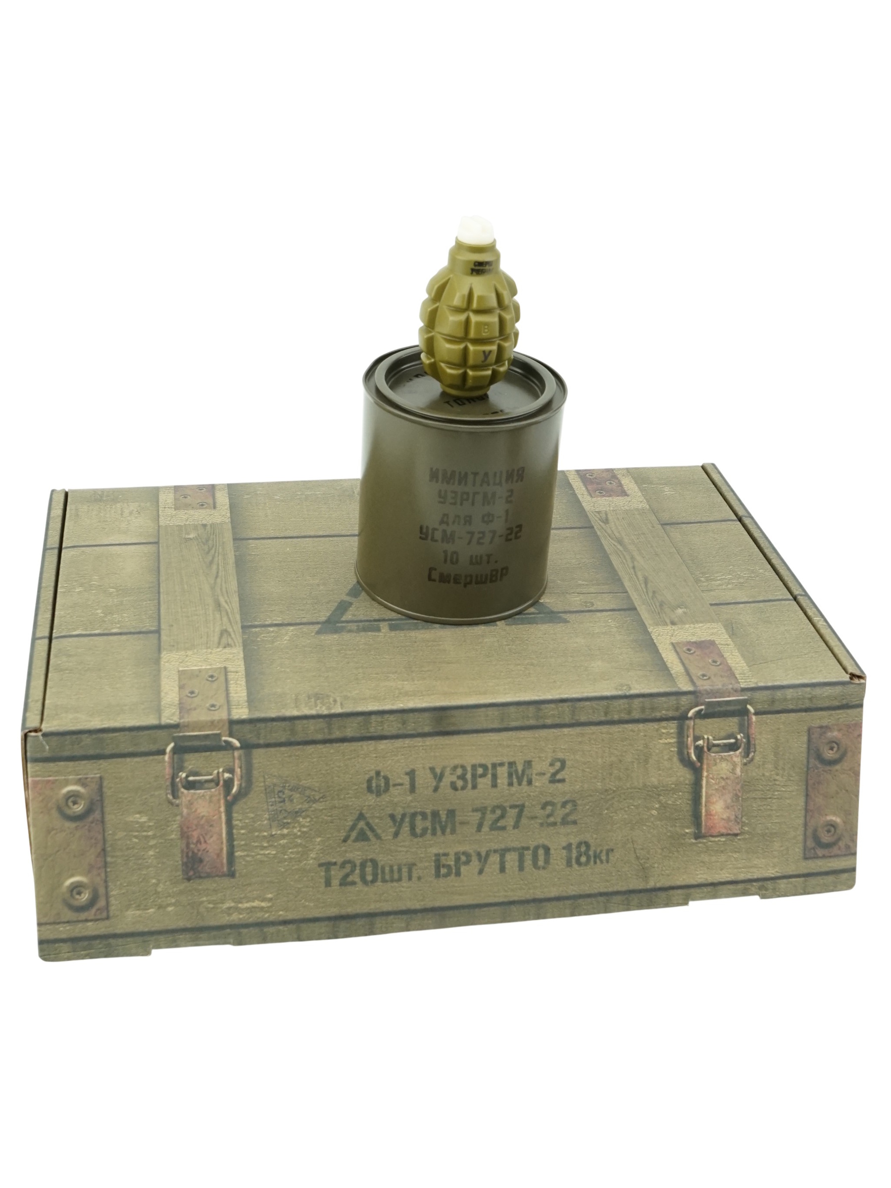 Имитация запала УЗРГМ с металлическим предохранительным рычагом, его снаряжение в корпус гранаты по средствам вкручивания, так же соответствуют высокому уровню копийности с боевым аналогом. Так же воспроизведен полный алгоритм приведения данных гранат к бою, а именно воссоздан внешний вид ящика и внутреннего расположения комплектующих данных гранат, принципы хранения узлов и их упаковки. Полностью повторяет внешний вид и действие боевого образца. Предохранительный рычаг из металла с аутентичными маркировками, печатями даты производства активный, время замедления как у боевого аналога.