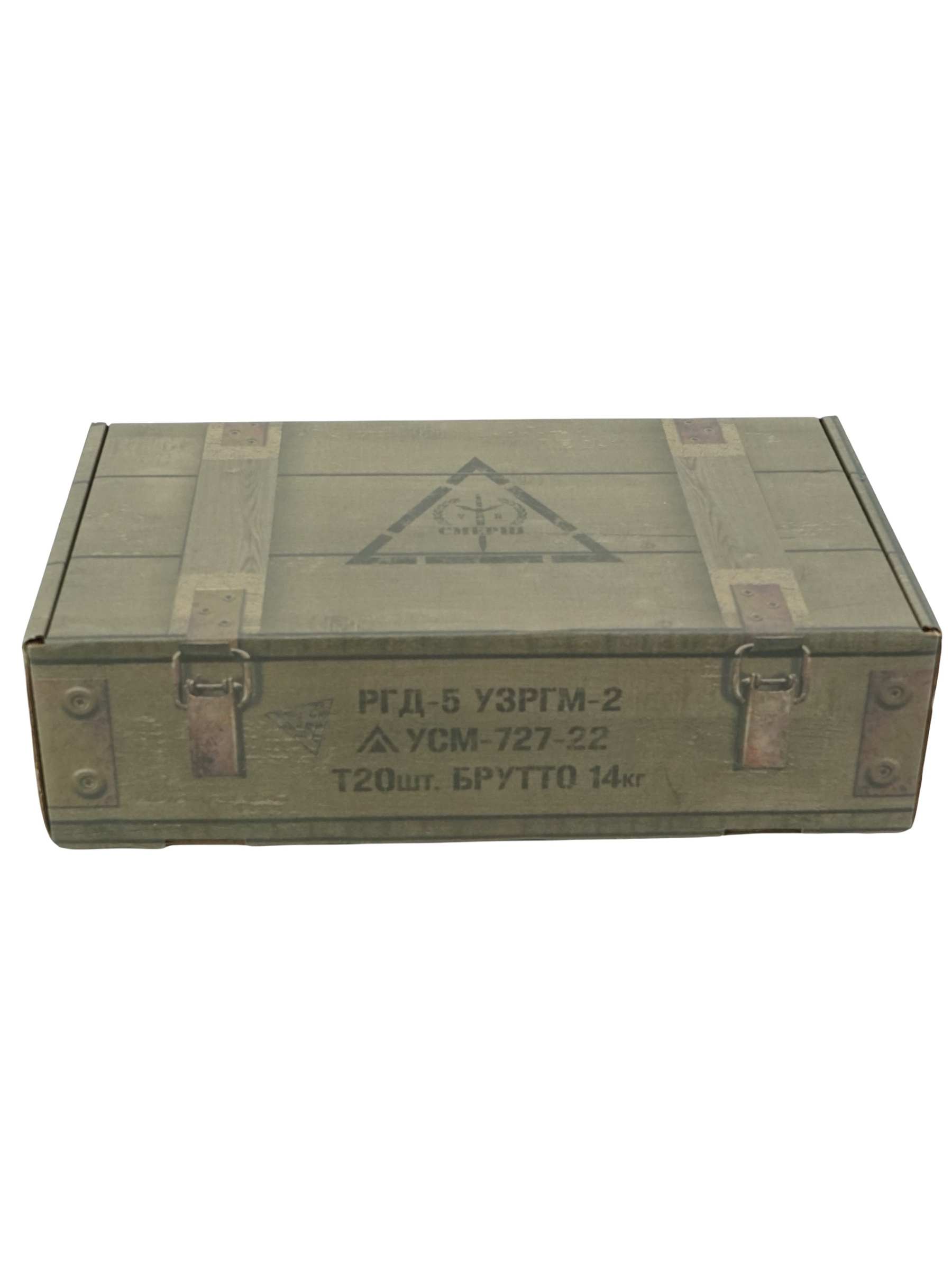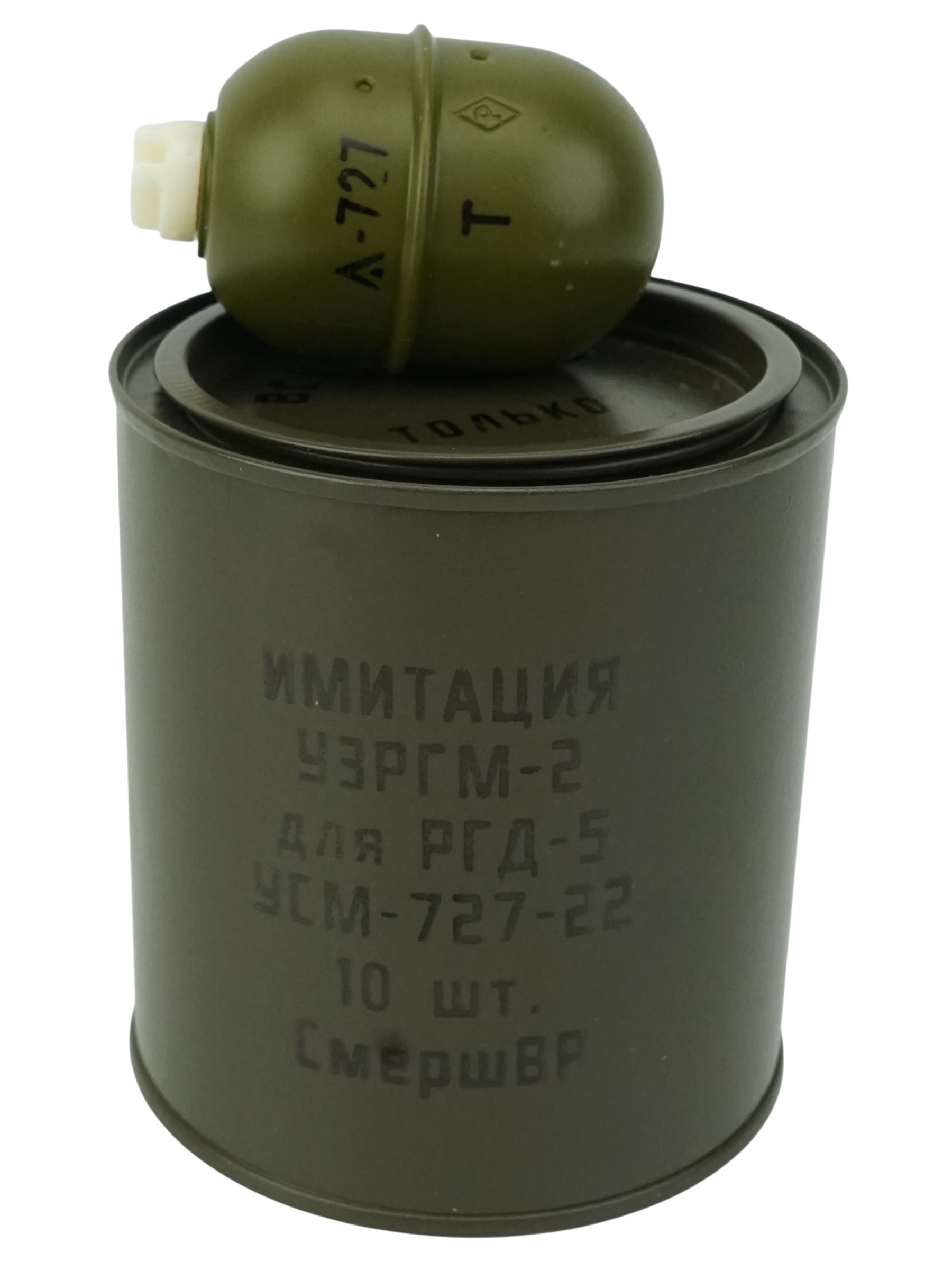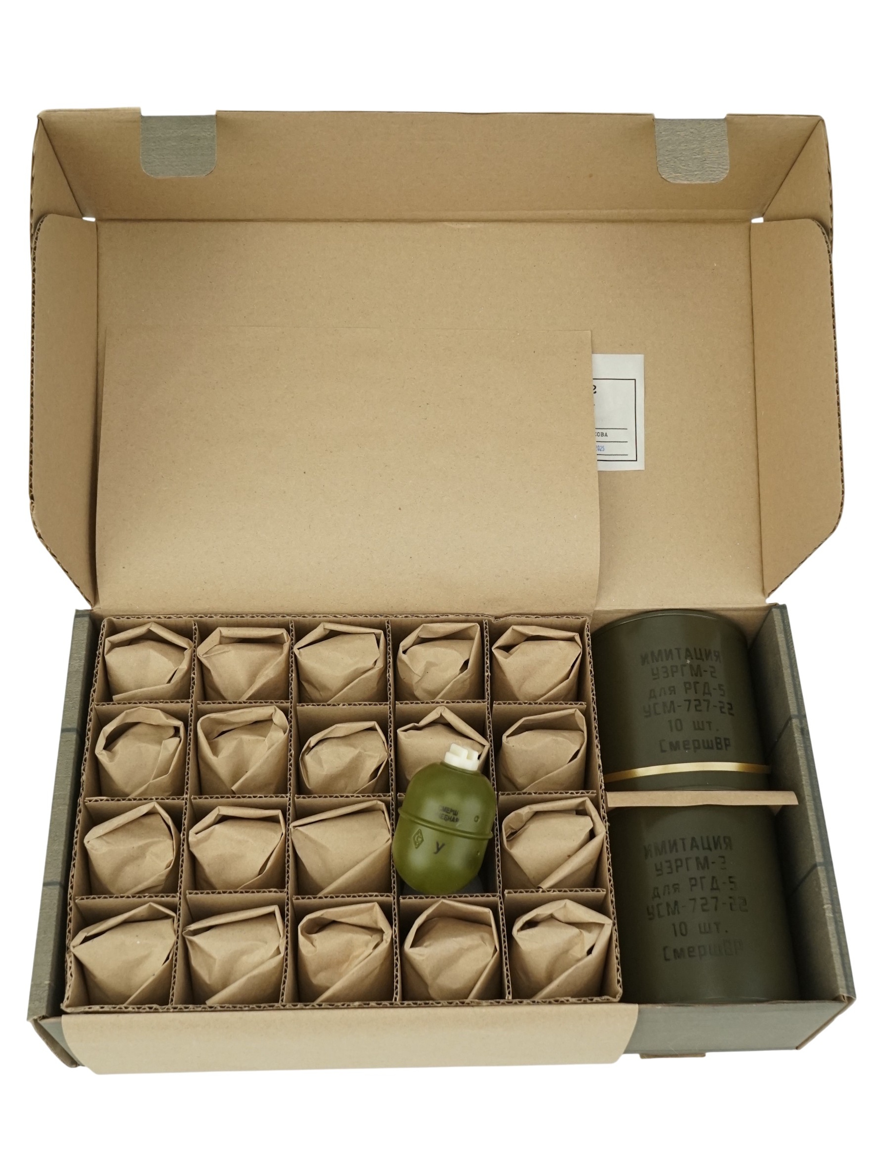 Имитация запала УЗРГМ с металлическим предохранительным рычагом, его снаряжение в корпус гранаты по средствам вкручивания, так же соответствуют высокому уровню копийности с боевым аналогом. Так же воспроизведен полный алгоритм приведения данных гранат к бою, а именно воссоздан внешний вид ящика и внутреннего расположения комплектующих данных гранат, принципы хранения узлов и их упаковки. Полностью повторяет внешний вид и действие боевого образца. Предохранительный рычаг из металла с аутентичными маркировками, печатями даты производства активный, время замедления как у боевого аналога.