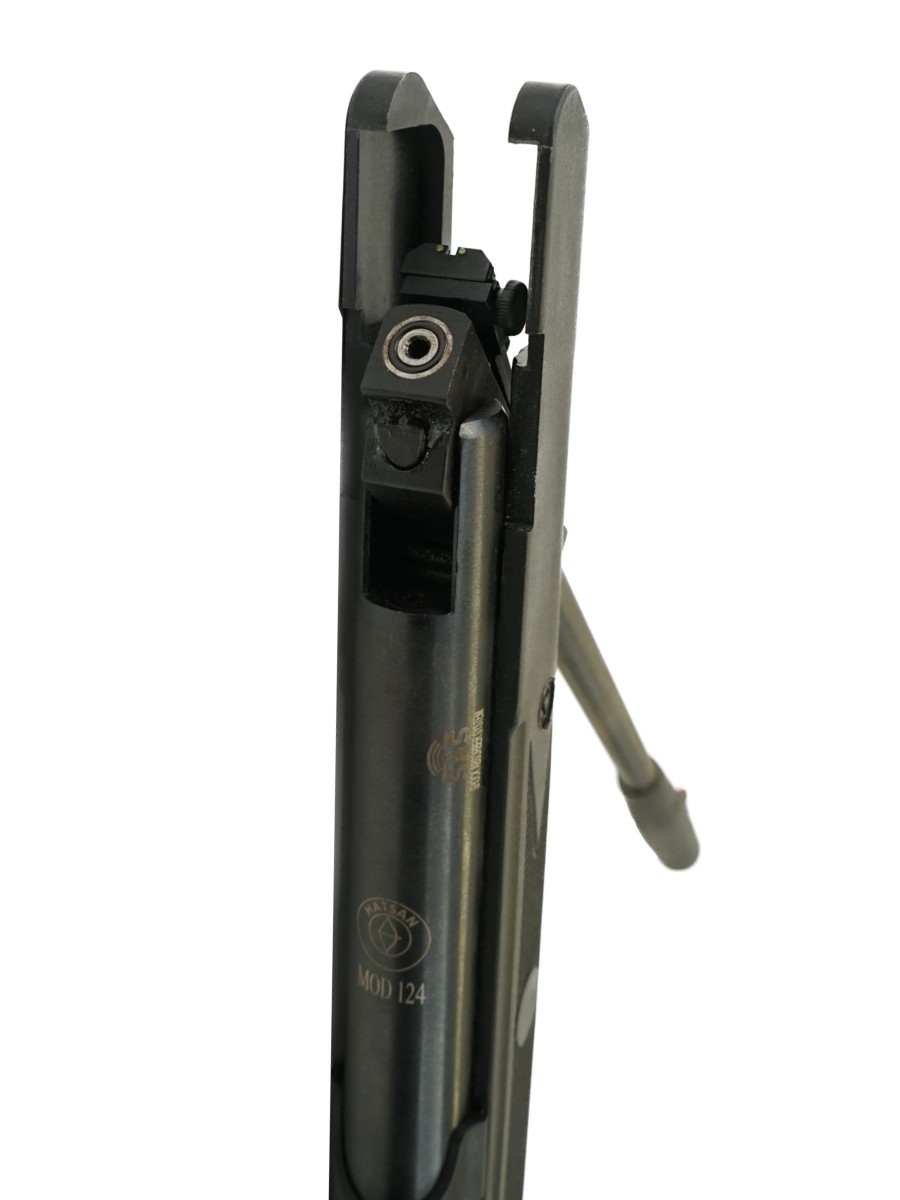 На винтовке установлены открытые прицельные устройства с фиберглассовыми нитями, которые весьма удобны в полевых условиях. При желании можно установить коллиматор или оптический прицел, для этого есть 2 вида креплений: планка Weaver и «ласточкин хвост». Hatsan 124 является облегченной моделью весом в 3,25 кг и длиной 1,2 метра.