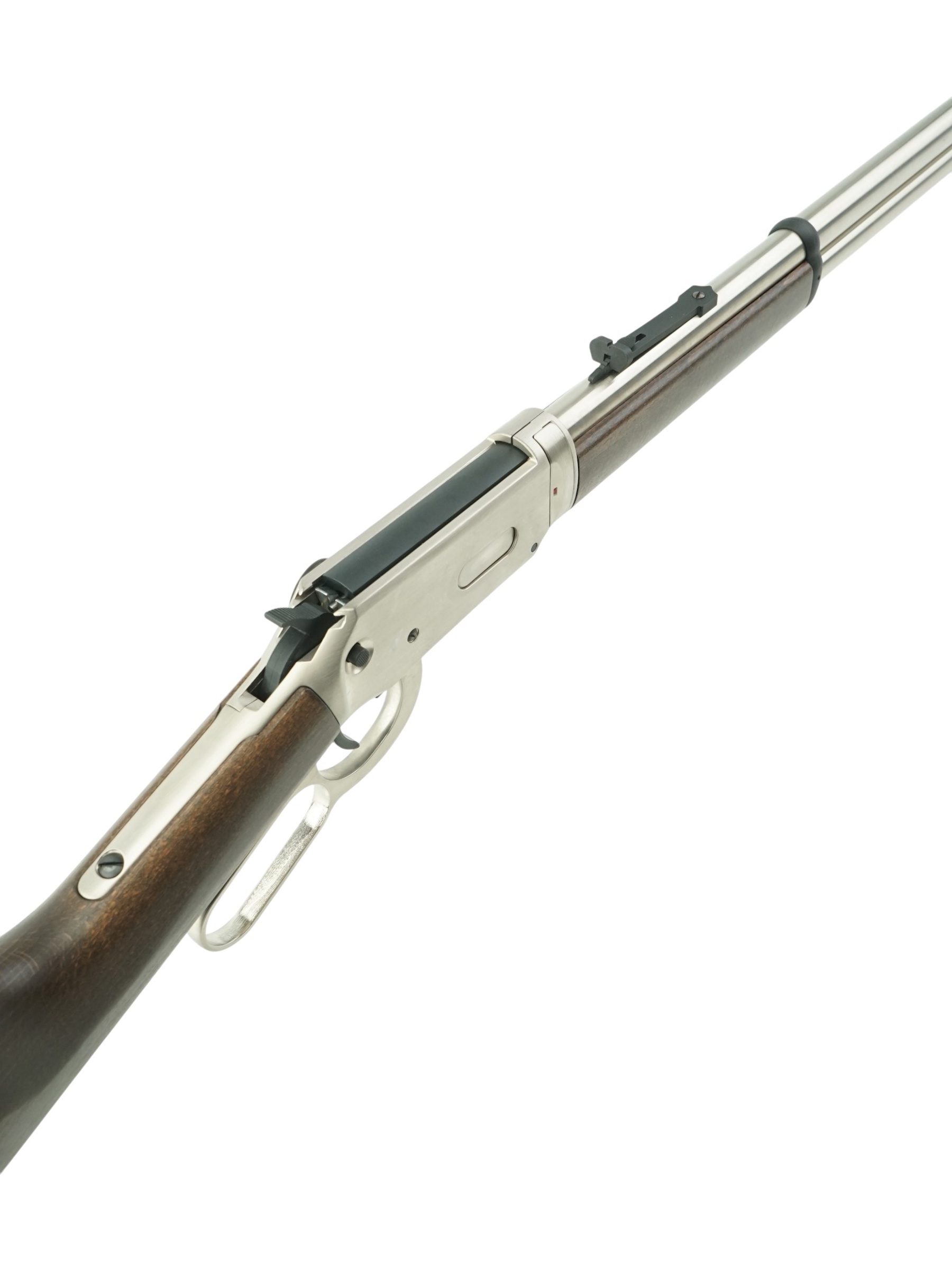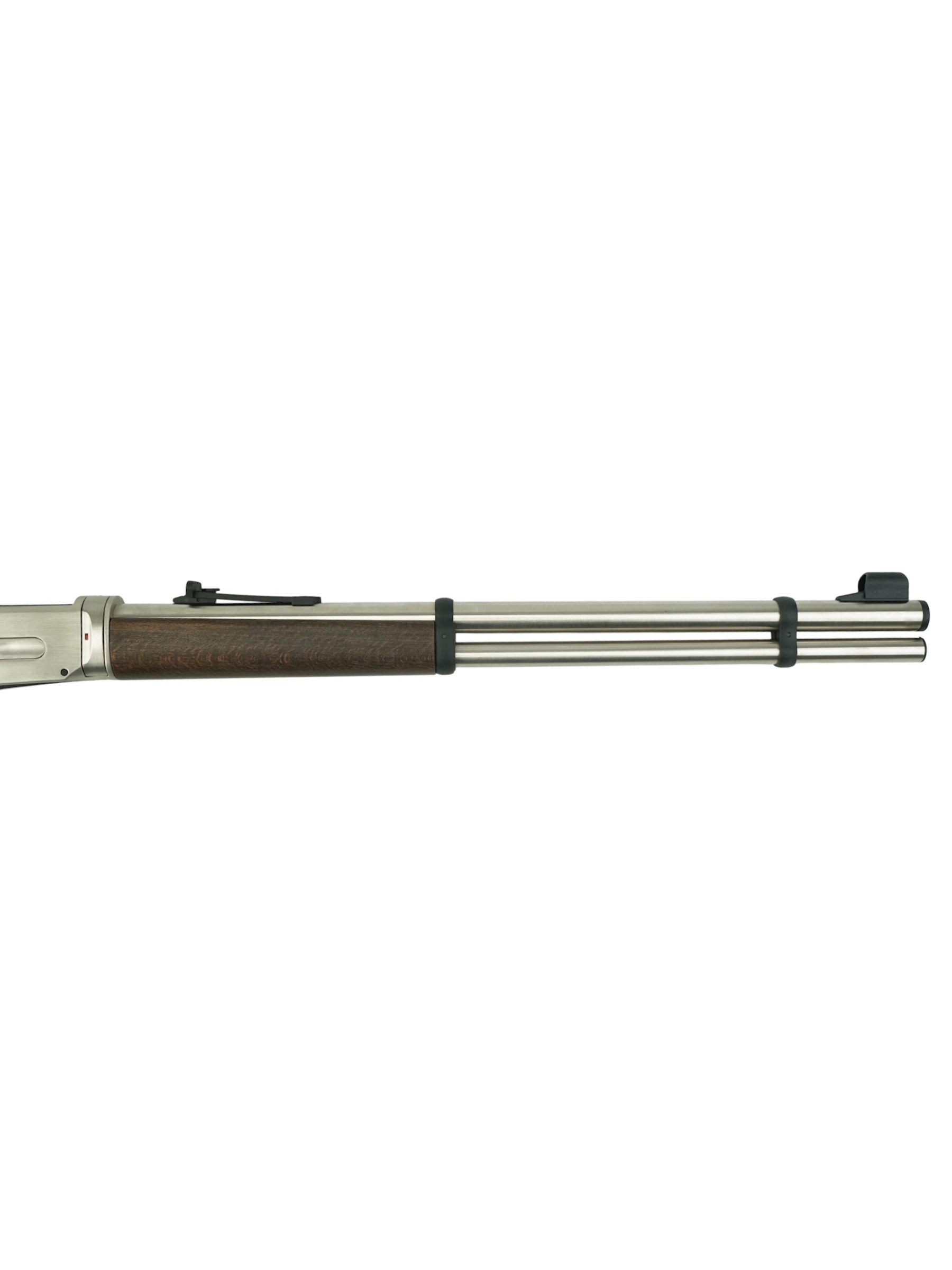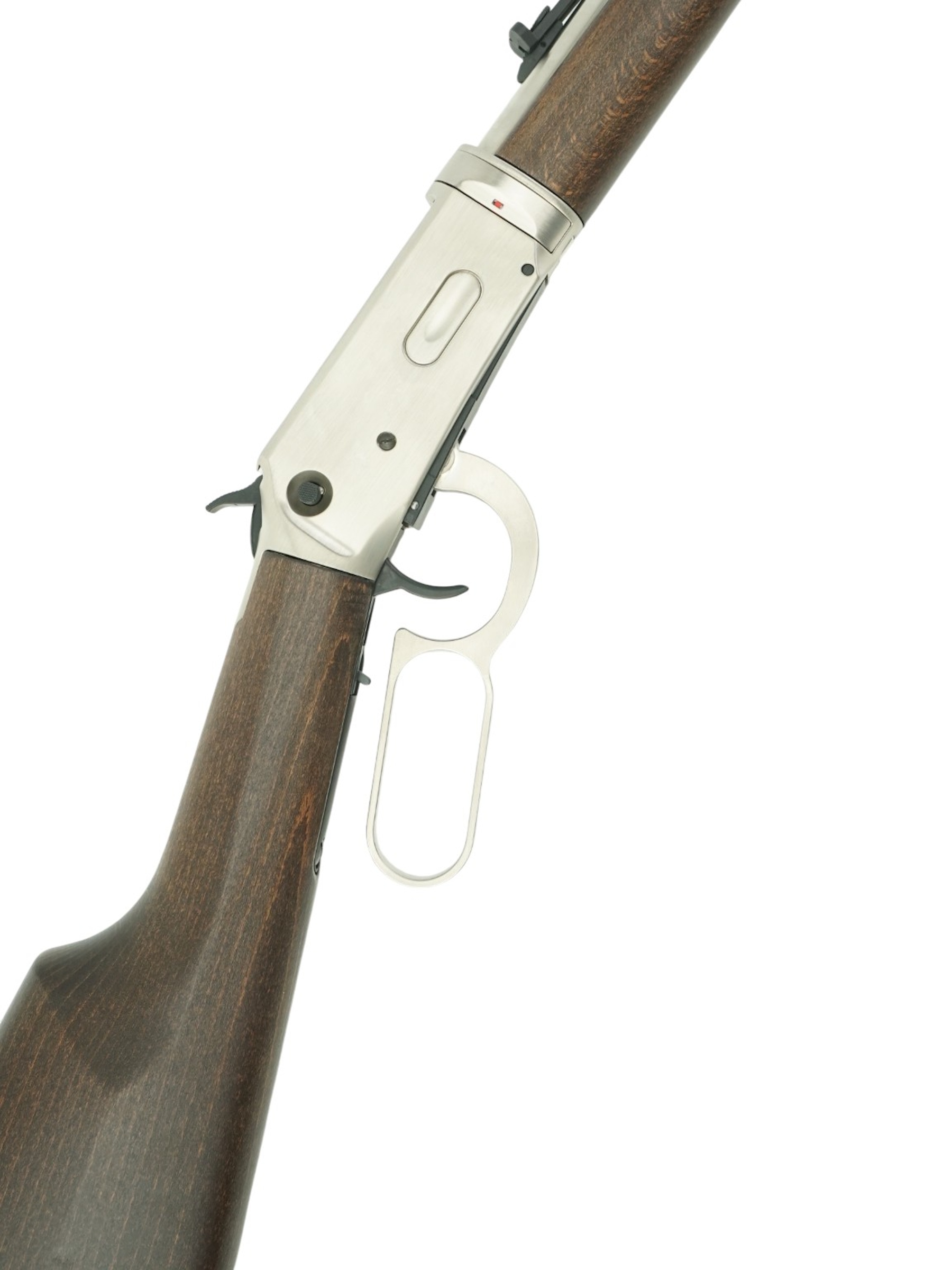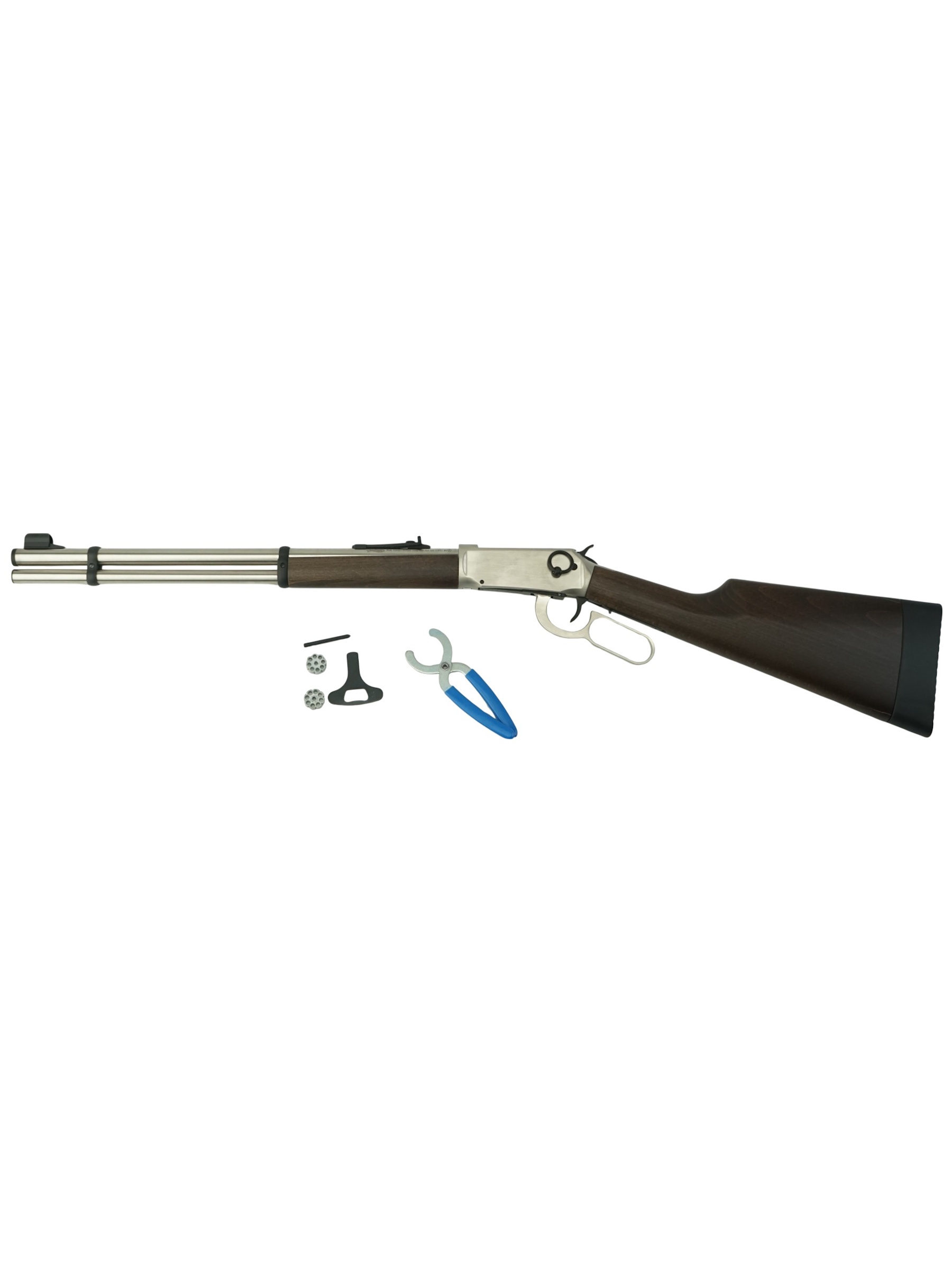 Модель разработана под баллоны с газом 88 г, баллон устанавливается в приклад с тыльной его стороны. Перезарядка винтовки Umarex Walther Lever Action Steel Finish производится аналогично боевому прототипу – с помощью скобы Генри. В отличие от прототипа, в этой винтовке установлен барабанный магазин, скрытый в корпусе.