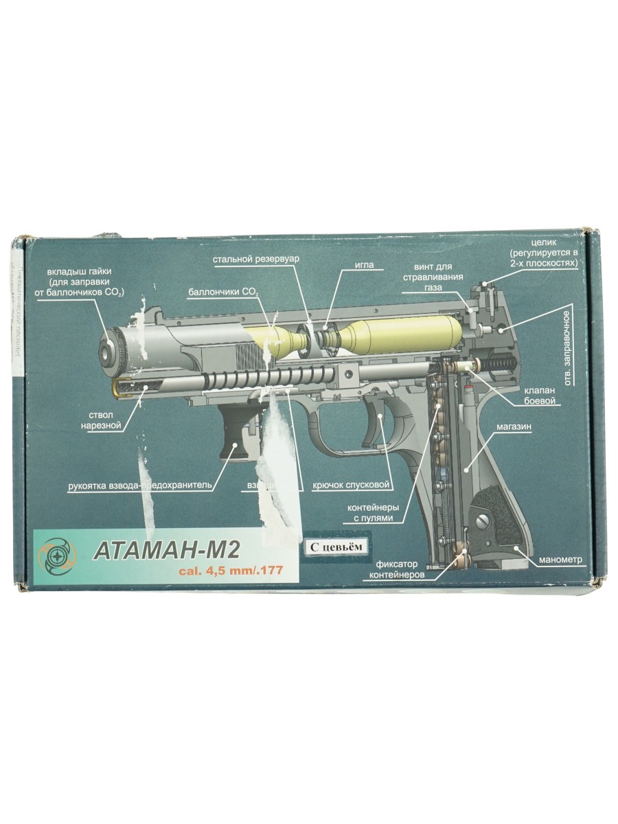 Пистолет Атаман-М2 от бренда «А+А» (Тула) отличается наличием регулируемых мушки и целика, в качестве дополнительной опции возможна установка планки Вивера для использования аксессуаров. Есть возможность установки саундмодератора. Пистолет имеет простую и надежную конструкцию, ствол и основа изготовлены из металла, его корпус – пластиковый. Предусмотрен кнопочный переключатель. Длина пистолета составляет 24,7 см, а вес – 0,7 кг. Комплектация состоит из штуцера в сборе, ремкомплекта, магазина, заправочного клапана, а также паспорта.