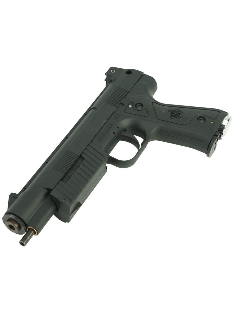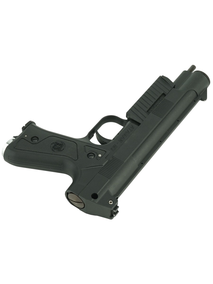 Заправить пистолет можно также и от иных источников – например, от компрессора или ручного насоса. Благодаря возможности установки дополнительного резервуара оружие получает существенный запас работоспособности. Стреляет пистолет Атаман-М2 пулями 4,5 мм. Магазин отъемного типа, рассчитан на 20 боеприпасов. Ствол оружия нарезной, кучность стрельбы с расстояния 25 метров составляет 45 мм. УСМ – только двойного действия, предусмотрен полуавтоматический режим ведения огня.
