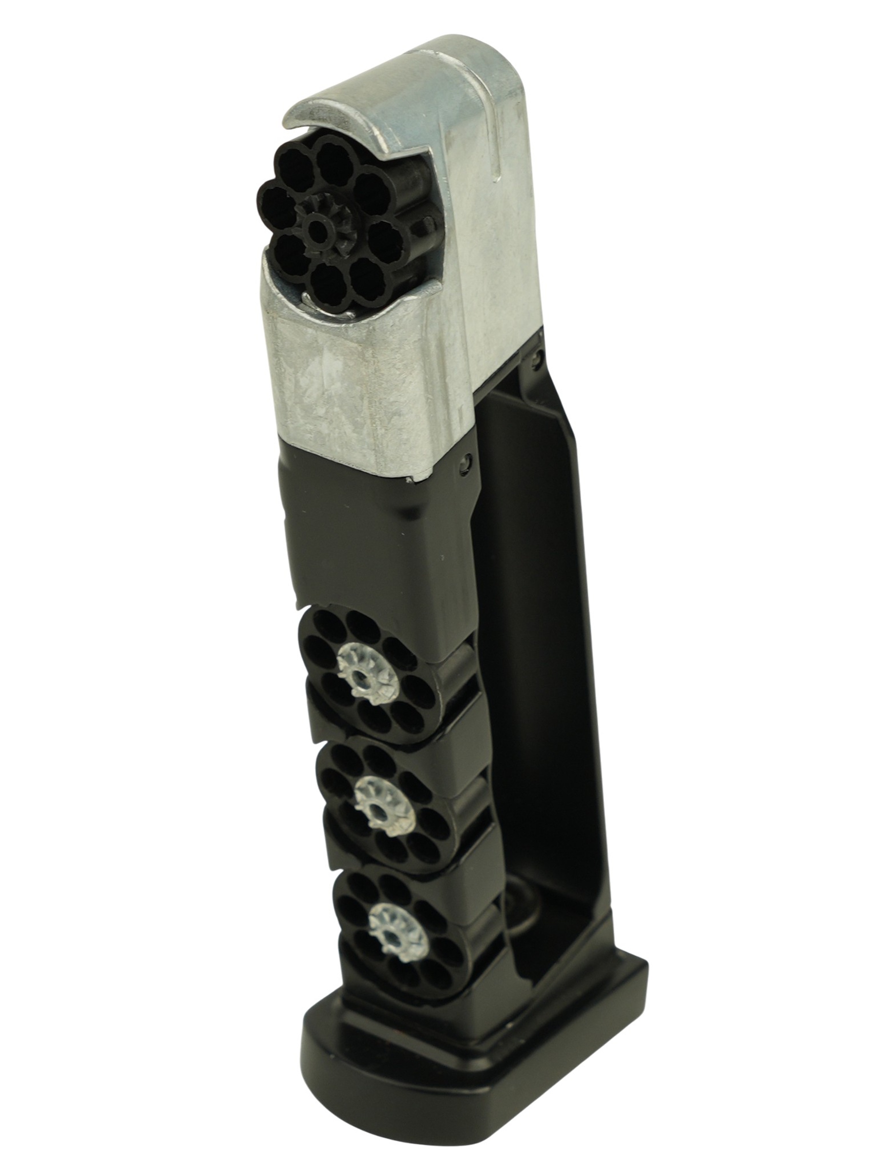 Пневматический пистолет Borner 92 разработан для стрельбы свинцовыми пулями калибра 4,5 мм. В основе его работы лежит газобаллонная система, активируемая кнопкой, расположенной у спусковой скобы. В специальном отсеке размещается основной барабан и три дополнительных магазина, каждый из которых рассчитан на восемь зарядов.