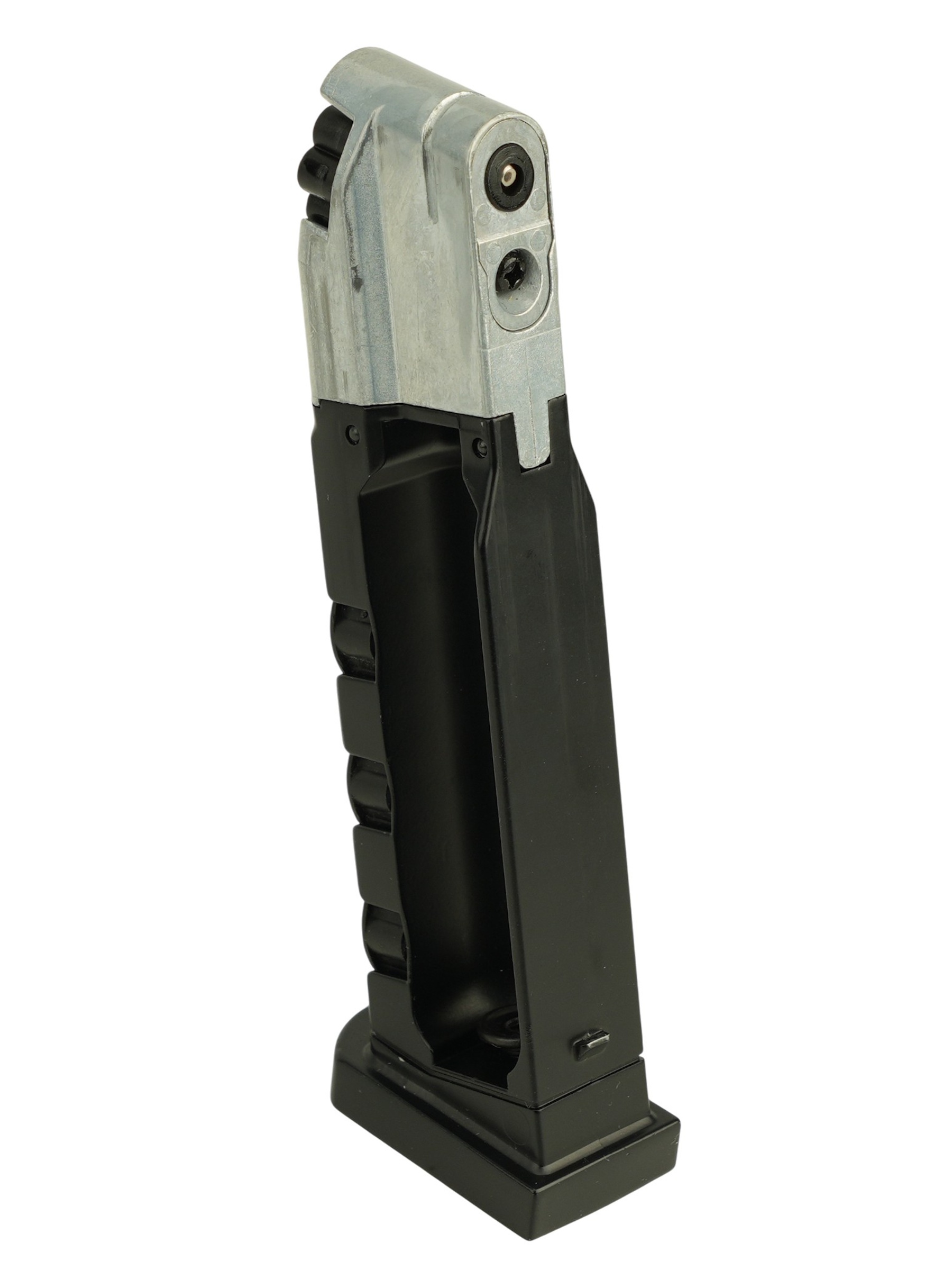 Внутри рукояти предусмотрено пространство для стандартного 12-граммового CO₂ баллона. Чтобы установить его, необходимо открутить поджимной винт, расположенный на основании рукоятки. В комплекте идет шестигранник для фиксации резервуара, а при корректной установке раздается характерный шипящий звук, свидетельствующий о проколе баллона и начале подачи газа.